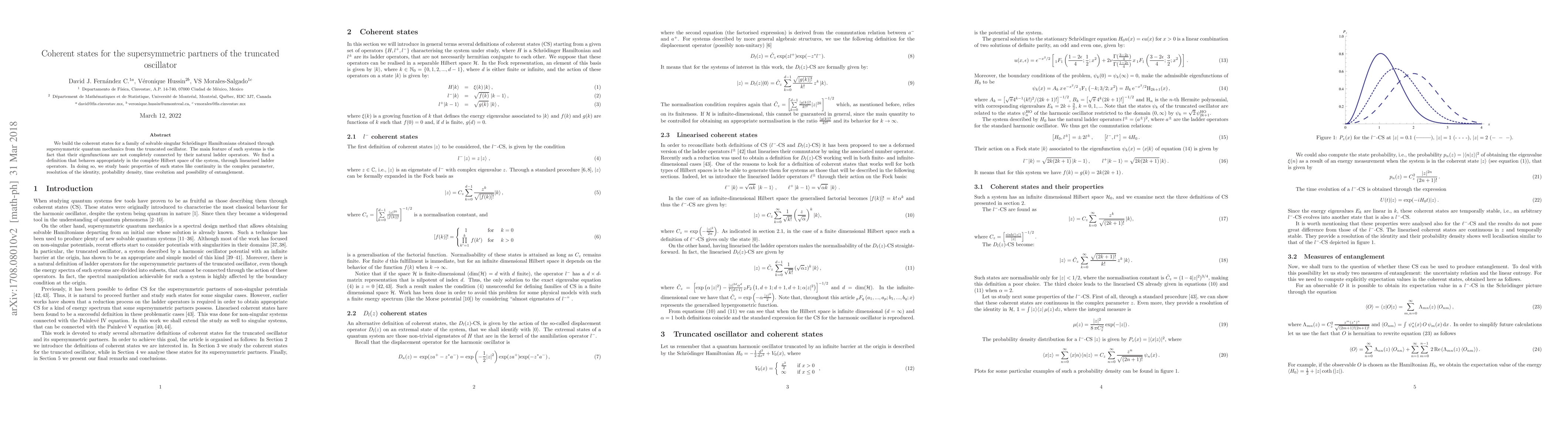 We build the coherent states for a family of solvable singular Schr\"odinger Hamiltonians obtained through supersymmetric quantum mechanics from the truncated oscillator. The main feature of such systems is the fact that their eigenfunctions are not completely connected by their natural ladder operators. We find a definition that behaves appropriately in the complete Hilbert space of the system, through linearised ladder operators. In doing so, we study basic properties of such states like continuity in the complex parameter, resolution of the identity, probability density, time evolution and possibility of entanglement.