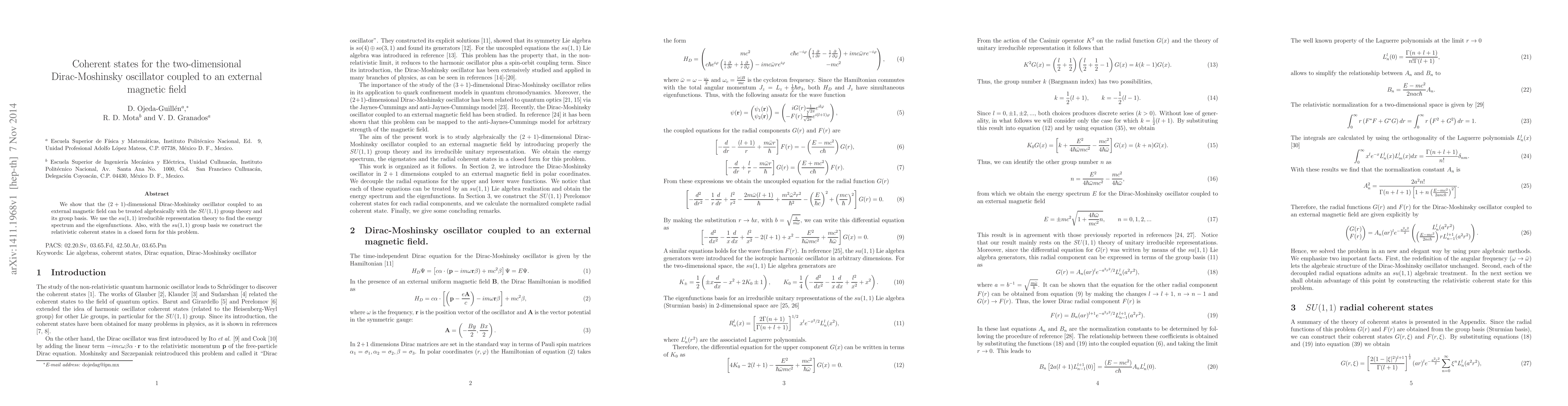 We show that the $(2+1)$-dimensional Dirac-Moshinsky oscillator coupled to an external magnetic field can be treated algebraically with the $SU(1,1)$ group theory and its group basis. We use the $su(1,1)$ irreducible representation theory to find the energy spectrum and the eigenfunctions. Also, with the $su(1,1)$ group basis we construct the relativistic coherent states in a closed form for this problem.