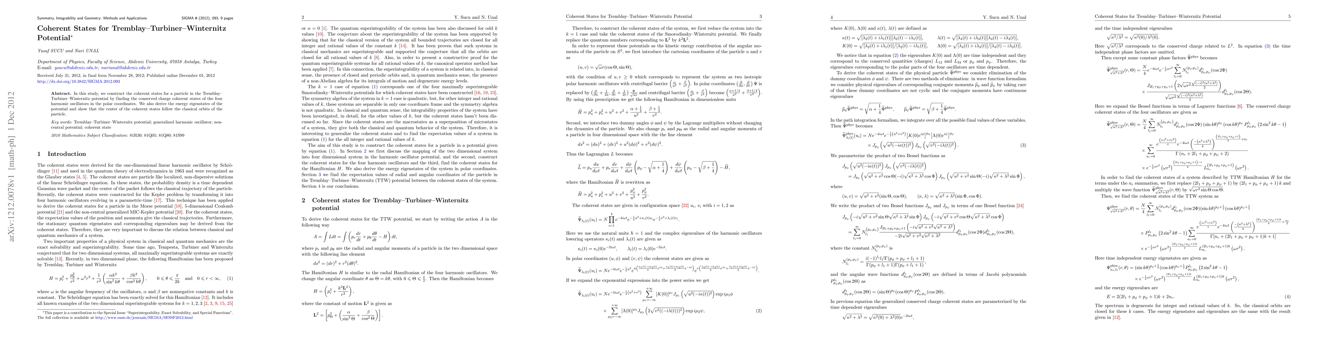 This paper constructs coherent states for the Tremblay-Turbiner-Winternitz potential by deriving the conserved charge coherent states from four harmonic oscillators in polar coordinates. It also determines the energy eigenstates and demonstrates that the coherent state centers trace the classical orbits of the particle.