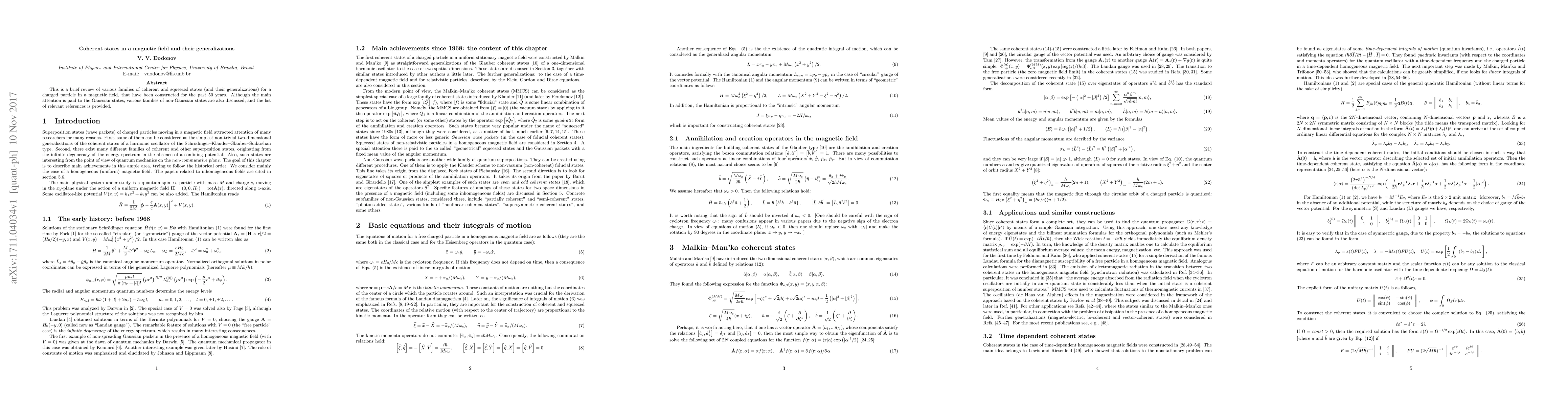 This paper reviews coherent and squeezed states for charged particles in a magnetic field, focusing on Gaussian states while also discussing non-Gaussian generalizations, with a comprehensive list of references.