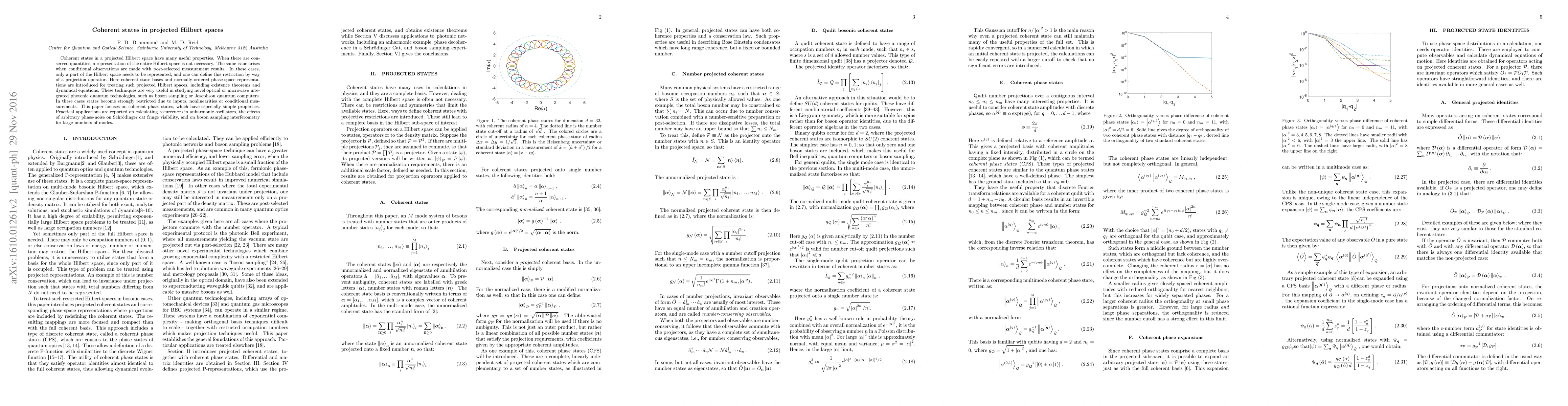 This paper explores coherent states in projected Hilbert spaces, introducing coherent state bases and phase-space representations for these restricted spaces. It applies these techniques to study phenomena in quantum technologies, including recurrences in anharmonic oscillators and the effects of phase-noise on Schrödinger cat fringe visibility.
