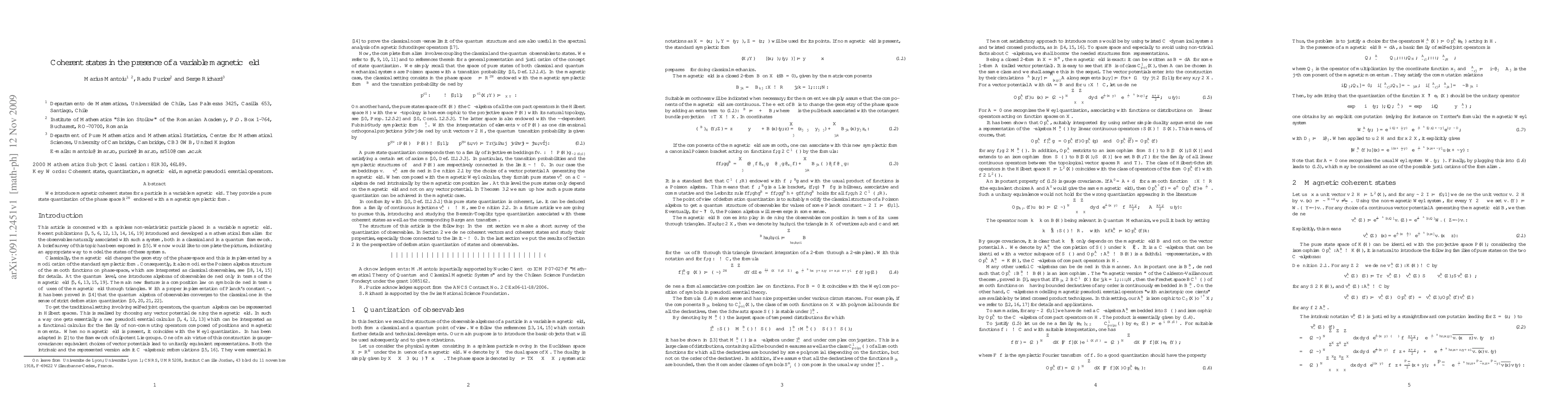 Summary: This paper introduces magnetic coherent states for particles in variable magnetic fields, offering a pure state quantization method for phase space with a magnetic symplectic form. These states provide a novel framework for understanding quantum mechanics in non-uniform magnetic fields.