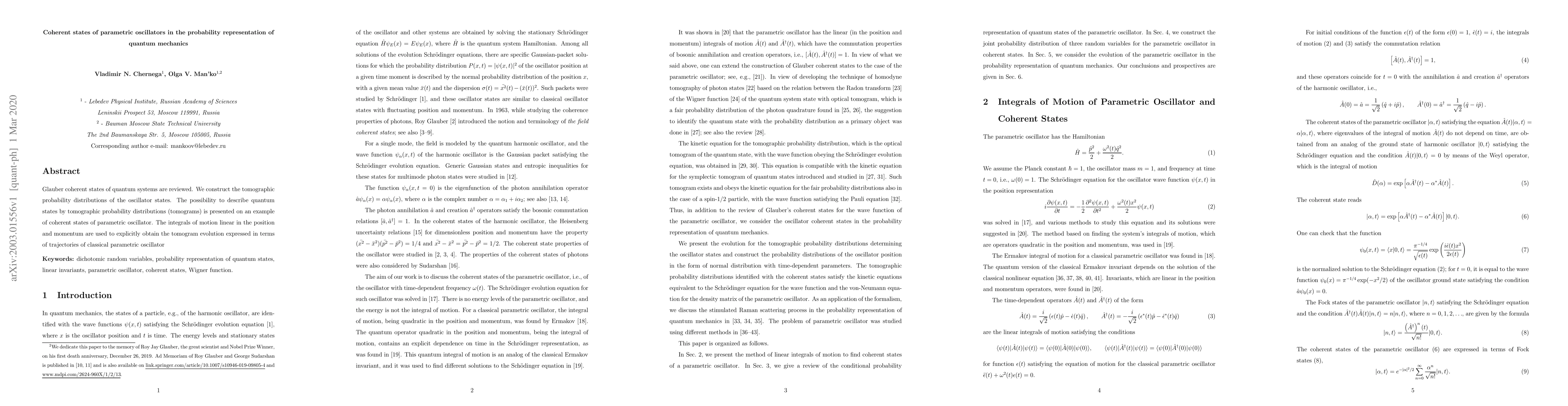 This paper reviews Glauber coherent states and constructs tomographic probability distributions for parametric oscillators, demonstrating how quantum states can be described using tomograms, with the evolution of these tomograms linked to the classical parametric oscillator trajectories.