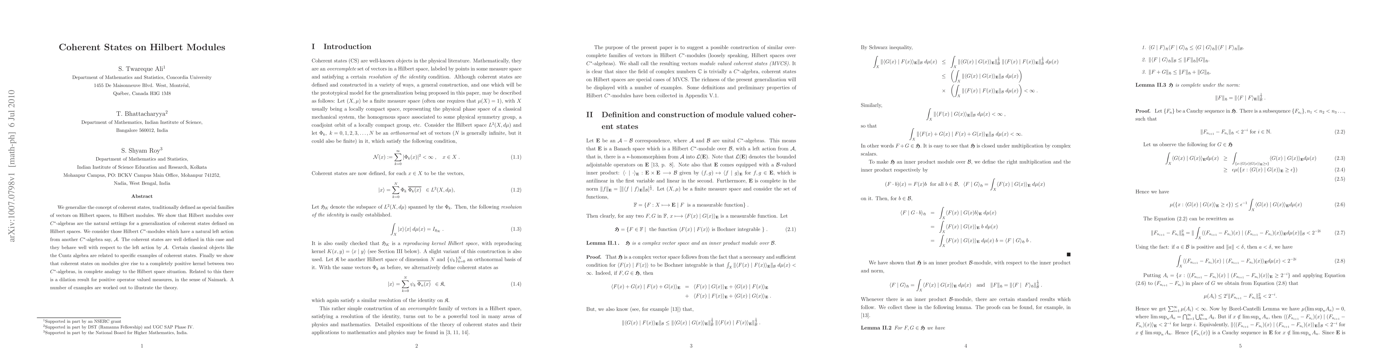 This paper generalizes the concept of coherent states from Hilbert spaces to Hilbert modules over $C^*$-algebras, demonstrating their behavior under left actions and establishing a dilation result akin to Naimark's theorem. Examples from classical objects, such as the Cuntz algebra, illustrate the practical application of this theory.