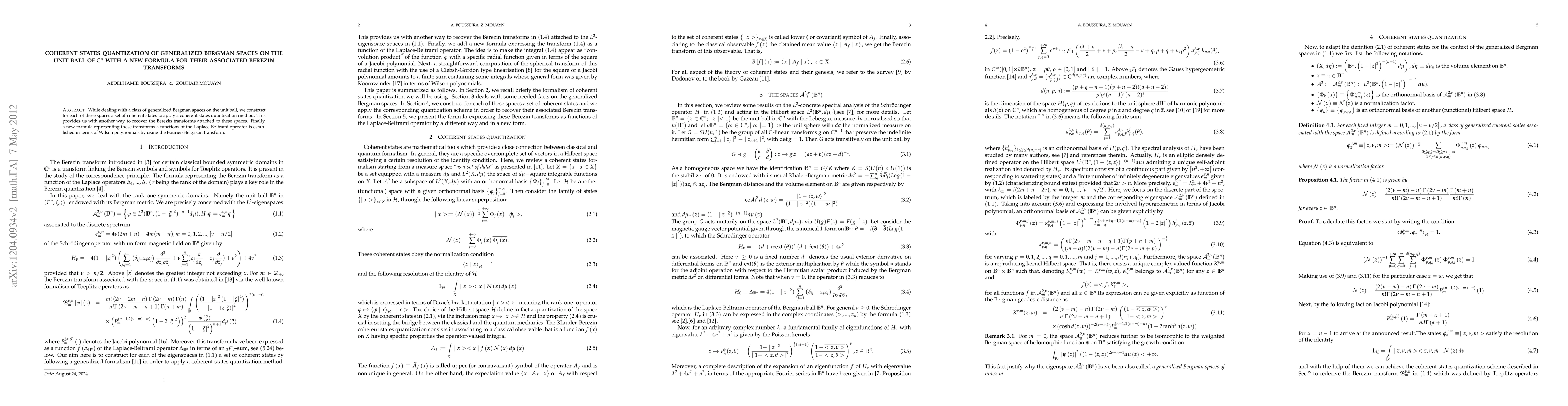 This paper constructs coherent states for generalized Bergman spaces on the unit ball in complex space, enabling a quantization method. It also introduces a novel formula for Berezin transforms expressed via the Laplace-Beltrami operator and Wilson polynomials through the Fourier-Helgason transform.