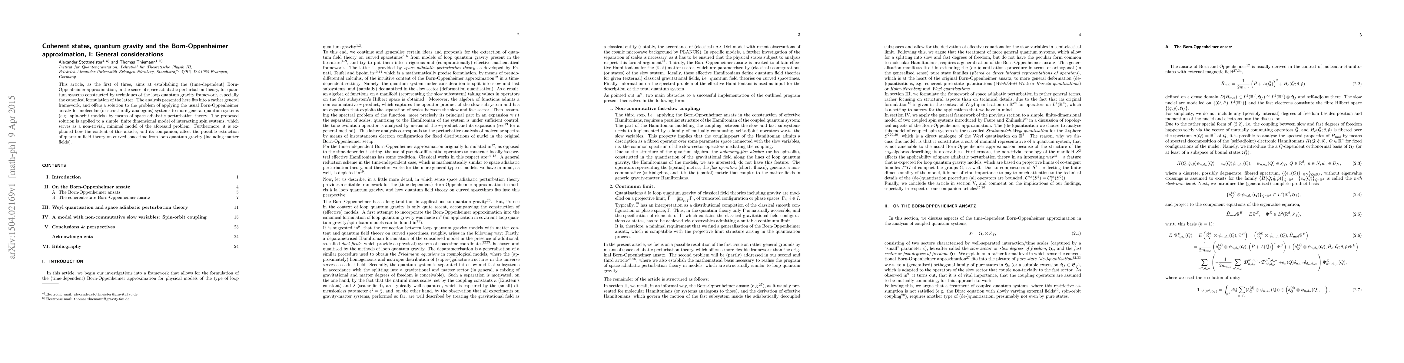 This article, as the first of three, aims at establishing the (time-dependent) Born-Oppenheimer approximation, in the sense of space adiabatic perturbation theory, for quantum systems constructed by techniques of the loop quantum gravity framework, especially the canonical formulation of the latter. The analysis presented here fits into a rather general framework, and offers a solution to the problem of applying the usual Born-Oppenheimer ansatz for molecular (or structurally analogous) systems to more general quantum systems (e.g. spin-orbit models) by means of space adiabatic perturbation theory. The proposed solution is applied to a simple, finite dimensional model of interacting spin systems, which serves as a non-trivial, minimal model of the aforesaid problem. Furthermore, it is explained how the content of this article, and its companion, affect the possible extraction of quantum field theory on curved spacetime from loop quantum gravity (including matter fields).