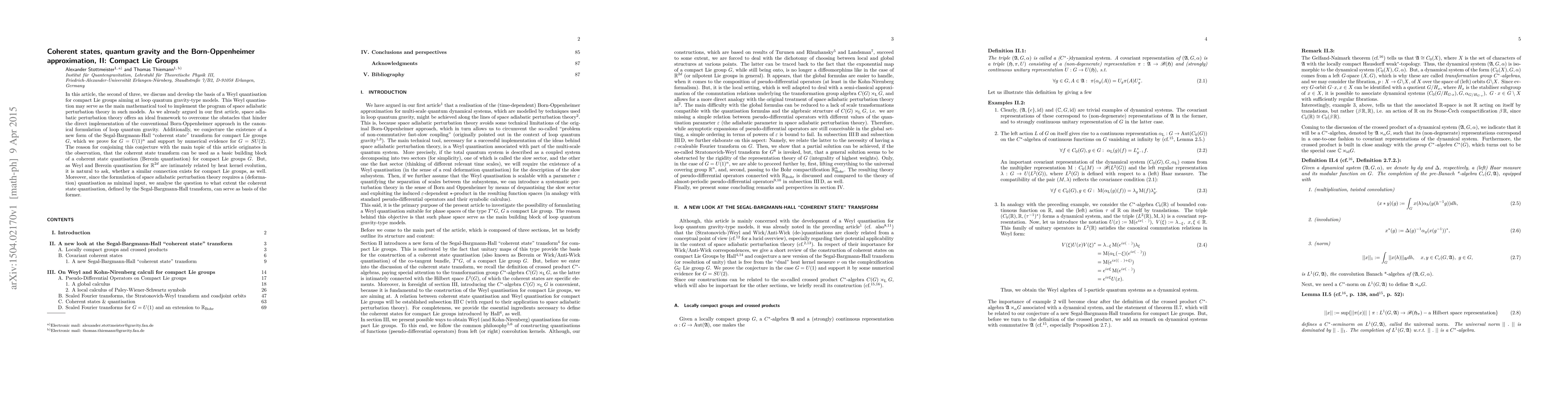 In this article, the second of three, we discuss and develop the basis of a Weyl quantisation for compact Lie groups aiming at loop quantum gravity-type models. This Weyl quantisation may serve as the main mathematical tool to implement the program of space adiabatic perturbation theory in such models. As we already argued in our first article, space adiabatic perturbation theory offers an ideal framework to overcome the obstacles that hinder the direct implementation of the conventional Born-Oppenheimer approach in the canonical formulation of loop quantum gravity. Additionally, we conjecture the existence of a new form of the Segal-Bargmann-Hall "coherent state" transform for compact Lie groups $G$, which we prove for $G=U(1)^{n}$ and support by numerical evidence for $G=SU(2)$. The reason for conjoining this conjecture with the main topic of this article originates in the observation, that the coherent state transform can be used as a basic building block of a coherent state quantisation (Berezin quantisation) for compact Lie groups $G$. But, as Weyl and Berezin quantisation for $\mathbb{R}^{2d}$ are intimately related by heat kernel evolution, it is natural to ask, whether a similar connection exists for compact Lie groups, as well. Moreover, since the formulation of space adiabatic perturbation theory requires a (deformation) quantisation as minimal input, we analyse the question to what extent the coherent state quantisation, defined by the Segal-Bargmann-Hall transform, can serve as basis of the former.