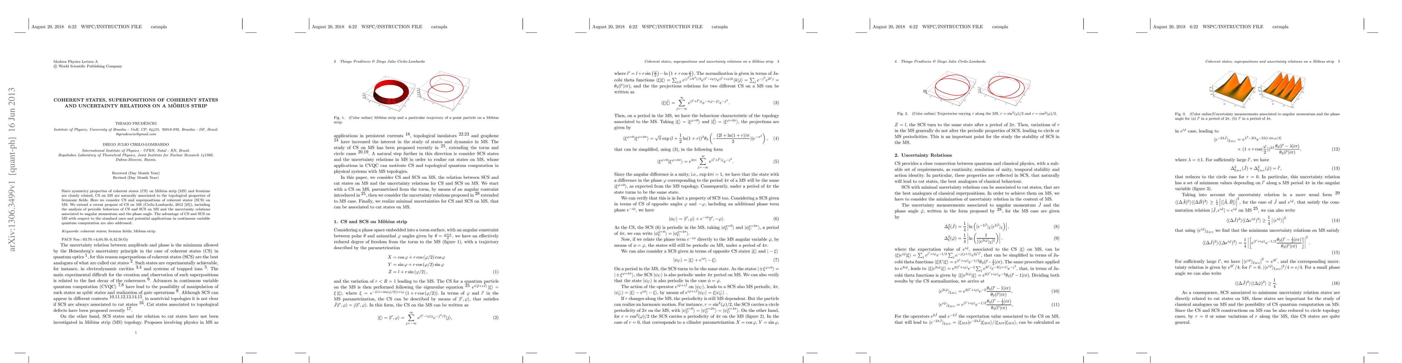 Since symmetry properties of coherent states (CS) on M\"obius strip (MS) and fermions are closely related, CS on MS are naturally associated to the topological properties of fermionic fields. Here we consider CS and superpositions of coherent states (SCS) on MS. We extend a recent propose of CS on MS (Cirilo-Lombardo, 2012 [25]), including the analysis of periodic behaviors of CS and SCS on MS and the uncertainty relations associated to angular momentum and the phase angle. The advantage of CS and SCS on MS with respect to the standard ones and potential applications in continuous variable quantum computation are also addressed.
