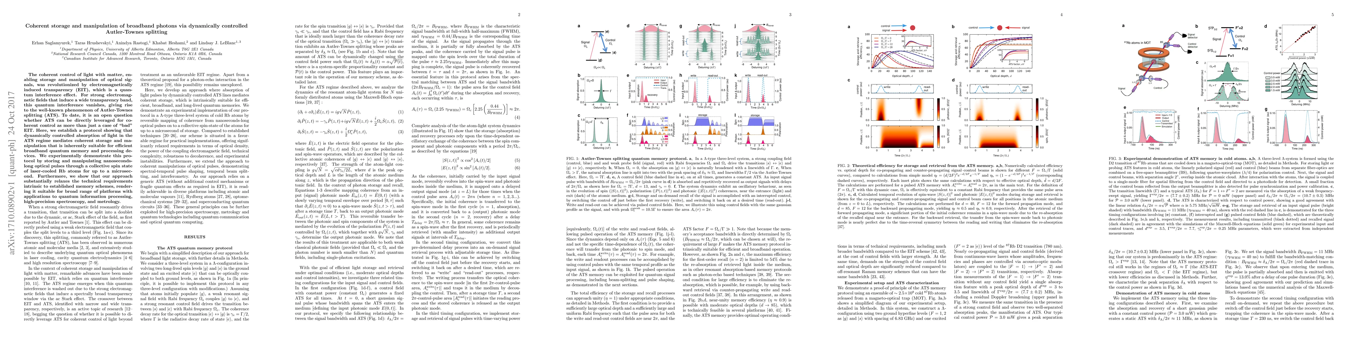 This paper presents a protocol for coherent storage and manipulation of broadband photons using dynamically controlled Autler-Townes splitting, demonstrating efficient nanosecond pulse storage and manipulation in a quantum memory system based on laser-cooled Rb atoms, and showing reduced technical requirements for quantum memory applications.