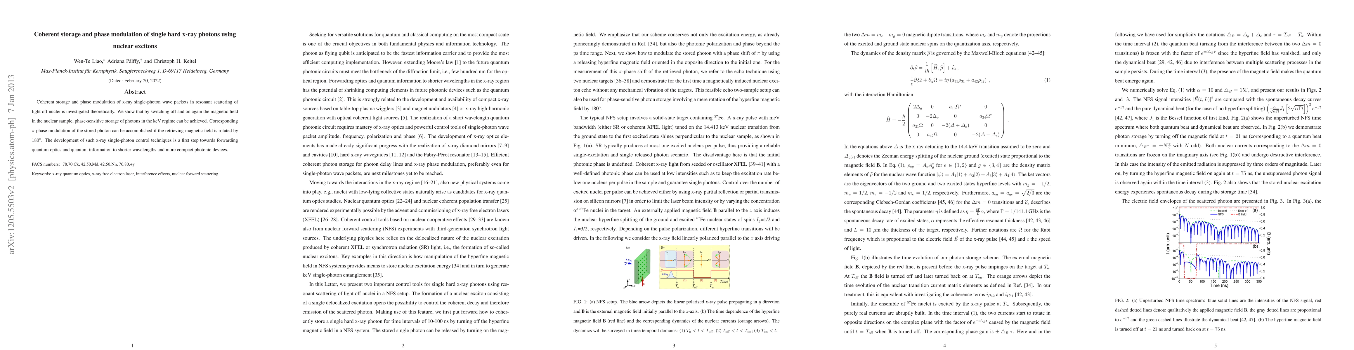 This paper explores the theoretical possibility of coherent storage and phase modulation of single hard x-ray photons using nuclear excitons. It demonstrates that by manipulating magnetic fields, phase-sensitive storage and $\pi$ phase modulation of x-ray photons can be achieved, paving the way for quantum optics advancements at shorter wavelengths.