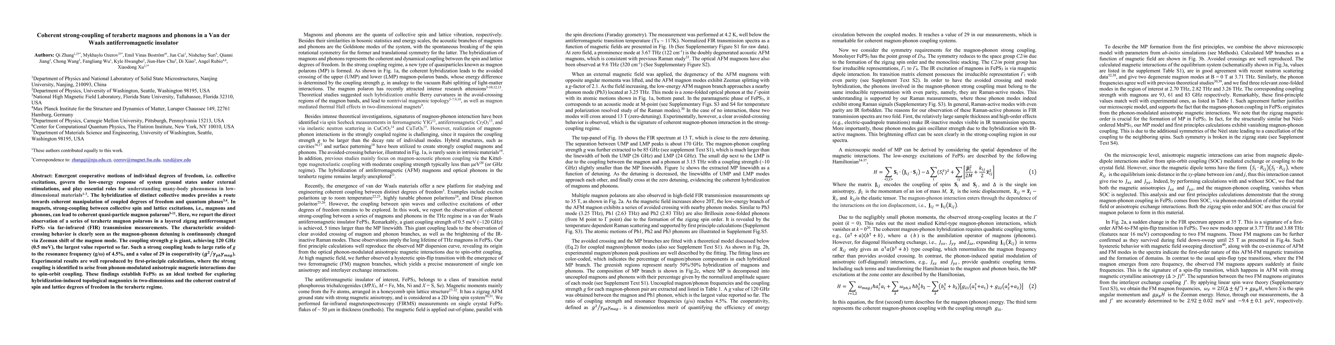 This paper reports the observation of strong coupling between terahertz magnons and phonons in the Van der Waals antiferromagnetic insulator FePS3, achieving a giant coupling strength of 120 GHz. The study demonstrates the formation of magnon polarons and highlights the potential for exploring topological magnonics and coherent control of spin and lattice interactions in two-dimensional materials.