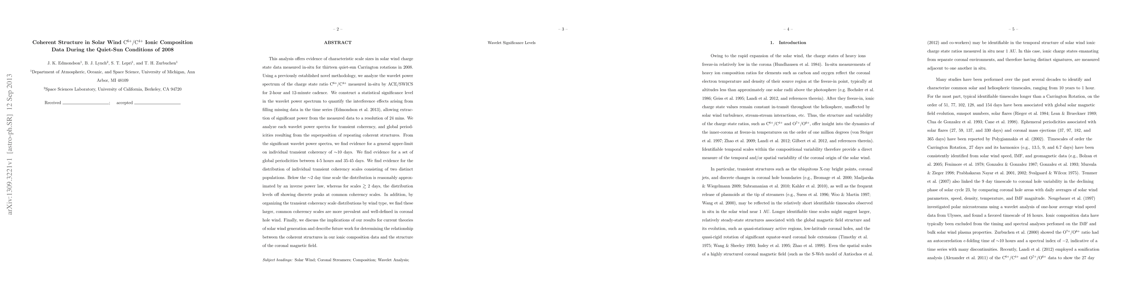 This analysis offers evidence of characteristic scale sizes in solar wind charge state data measured in-situ for thirteen quiet-sun Carrington rotations in 2008. Using a previously established novel methodology, we analyze the wavelet power spectrum of the charge state ratio C$^{6+}$/C$^{4+}$ measured in-situ by ACE/SWICS for 2-hour and 12-minute cadence. We construct a statistical significance level in the wavelet power spectrum to quantify the interference effects arising from filling missing data in the time series (Edmondson et al. 2013), allowing extraction of significant power from the measured data to a resolution of 24 mins. We analyze each wavelet power spectra for transient coherency, and global periodicities resulting from the superposition of repeating coherent structures. From the significant wavelet power spectra, we find evidence for a general upper-limit on individual transient coherency of $\sim$10 days. We find evidence for a set of global periodicities between 4-5 hours and 35-45 days. We find evidence for the distribution of individual transient coherency scales consisting of two distinct populations. Below the $\sim$2 day time scale the distribution is reasonably approximated by an inverse power law, whereas for scales $\gtrsim$2 days, the distribution levels off showing discrete peaks at common coherency scales. In addition, by organizing the transient coherency scale distributions by wind type, we find these larger, common coherency scales are more prevalent and well-defined in coronal hole wind. Finally, we discuss the implications of our results for current theories of solar wind generation and describe future work for determining the relationship between the coherent structures in our ionic composition data and the structure of the coronal magnetic field.