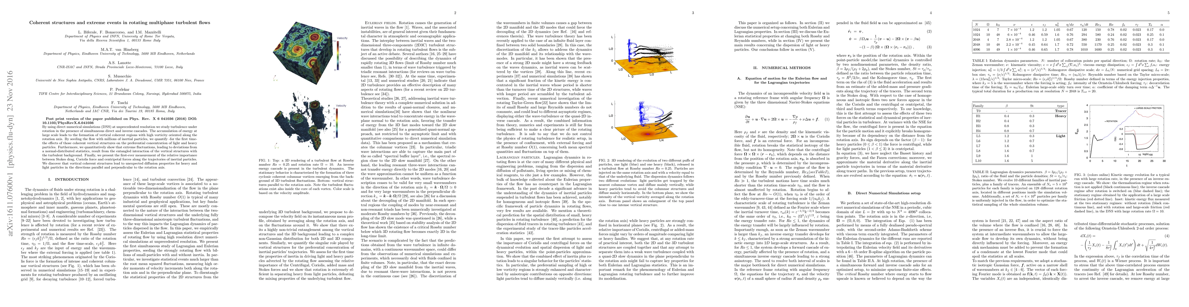 Researchers studied rotating turbulent flows with direct and inverse cascades, discovering coherent vertical structures that affect particle diffusion and lead to extreme fluctuations in particle concentrations. They found vortical structures impact heavy and light particles differently depending on direction relative to the rotation axis.