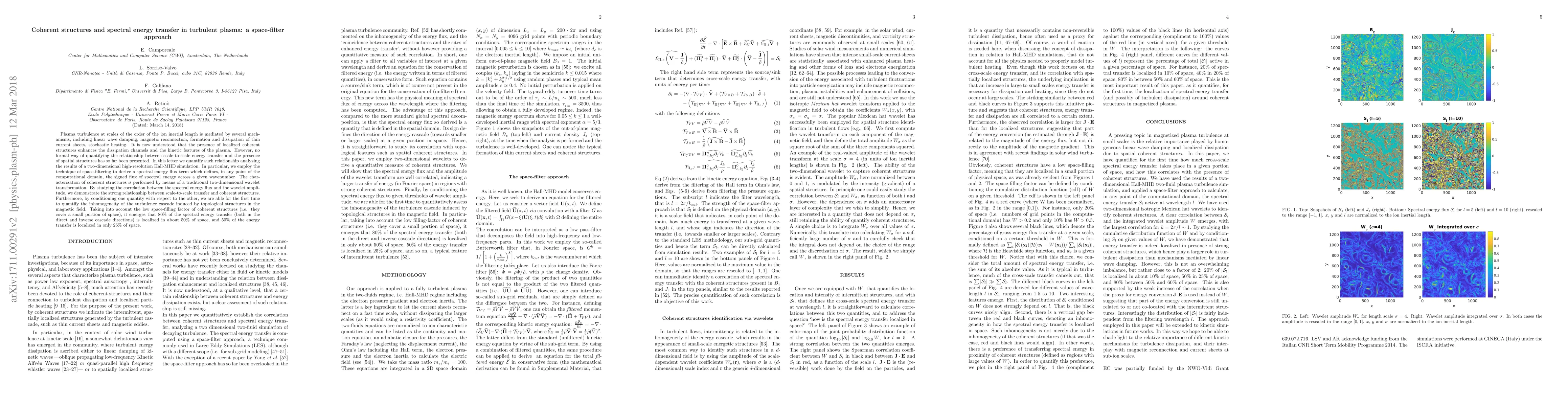 Plasma turbulence at scales of the order of the ion inertial length is mediated by several mechanisms, including linear wave damping, magnetic reconnection, formation and dissipation of thin current sheets, stochastic heating. It is now understood that the presence of localized coherent structures enhances the dissipation channels and the kinetic features of the plasma. However, no formal way of quantifying the relationship between scale-to-scale energy transfer and the presence of spatial structures has so far been presented. In this letter we quantify such relationship analyzing the results of a two-dimensional high-resolution Hall-MHD simulation. In particular, we employ the technique of space-filtering to derive a spectral energy flux term which defines, in any point of the computational domain, the signed flux of spectral energy across a given wavenumber. The characterization of coherent structures is performed by means of a traditional two-dimensional wavelet transformation. By studying the correlation between the spectral energy flux and the wavelet amplitude, we demonstrate the strong relationship between scale-to-scale transfer and coherent structures. Furthermore, by conditioning one quantity with respect to the other, we are able for the first time to quantify the inhomogeneity of the turbulence cascade induced by topological structures in the magnetic field. Taking into account the low filling-factor of coherent structures (i.e. they cover a small portion of space), it emerges that 80% of the spectral energy transfer (both in the direct and inverse cascade directions) is localized in about 50% of space, and 50% of the energy transfer is localized in only 25% of space.