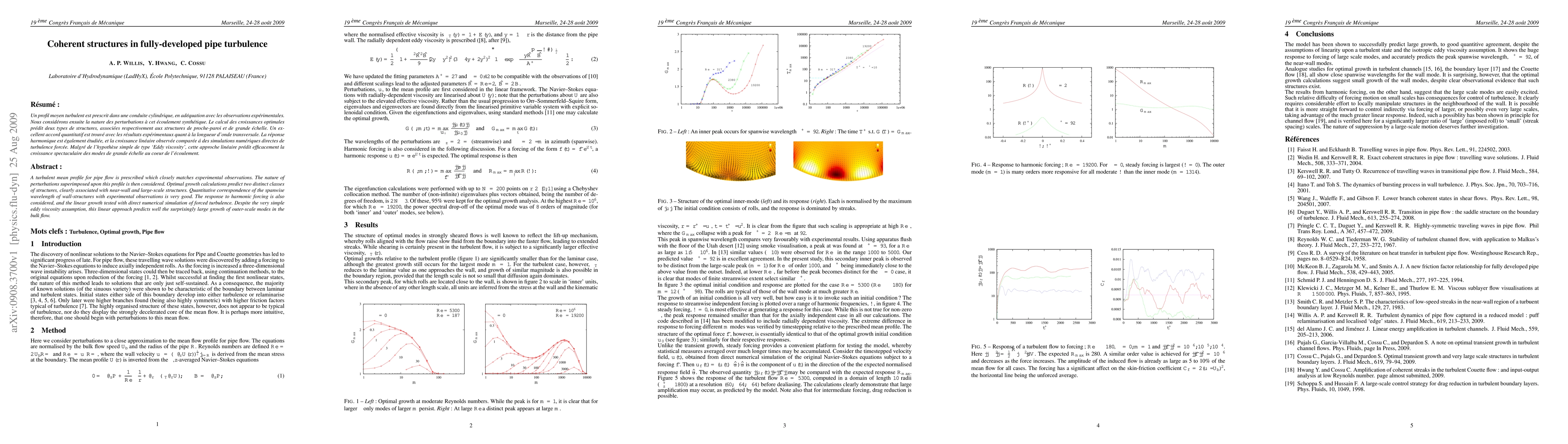 A turbulent mean profile for pipe flow is prescribed which closely matches experimental observations. The nature of perturbations superimposed upon this profile is then considered. Optimal growth calculations predict two distinct classes of structures, clearly associated with near-wall and large-scale structures. Quantitative correspondence of the spanwise wavelength of wall-structures with experimental observations is very good. The response to harmonic forcing is also considered, and the linear growth tested with direct numerical simulation of forced turbulence. Despite the very simple eddy viscosity assumption, this linear approach predicts well the surprisingly large growth of outer-scale modes in the bulk flow. Un profil moyen turbulent est prescrit dans une conduite cylindrique, en adequation avec les observations experimentales. Nous considerons ensuite la nature des perturbations a cet ecoulement synthetique. Le calcul des croissances optimales predit deux types de structures, associees respectivement aux structures de proche-paroi et de grande echelle. Un excellent accord quantitatif est trouve avec les resultats experimentaux quant a la longueur d'onde transversale. La reponse harmonique est egalement etudiee, et la croissance lineaire observee comparee a des simulations numeriques directes de turbulence forcee. Malgre de l'hypothese simple de type `Eddy viscosity', cette approche lineaire predit efficacement la croissance spectaculaire des modes de grande echelle au coeur de l'ecoulement.