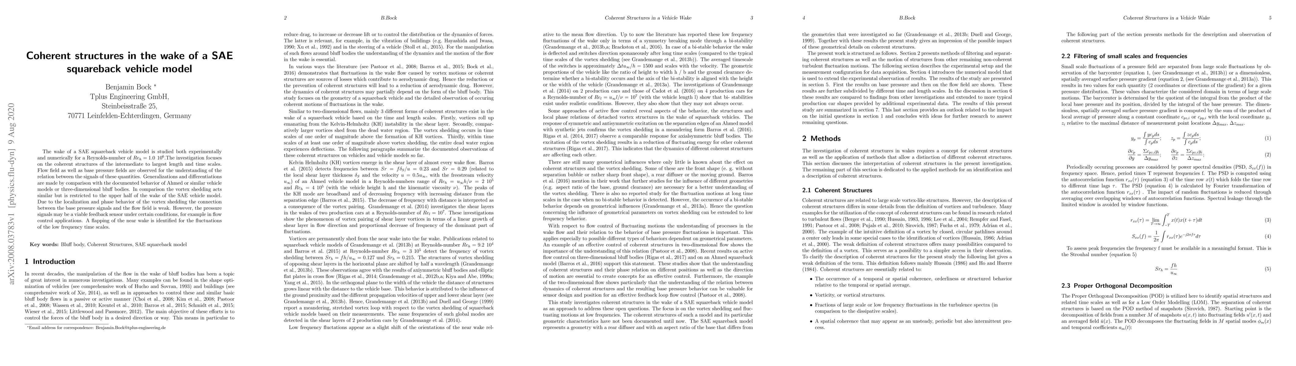 This study investigates the wake dynamics of a SAE squareback vehicle model at a Reynolds number of $ Re_h = 1.0 \hspace{5pt} 10^6 $, focusing on coherent structures. The research reveals that vortex shedding is similar to other bluff bodies but confined to the upper wake, with weak correlation between base pressure and flow field, though pressure signals could serve as feedback sensors in flow control.