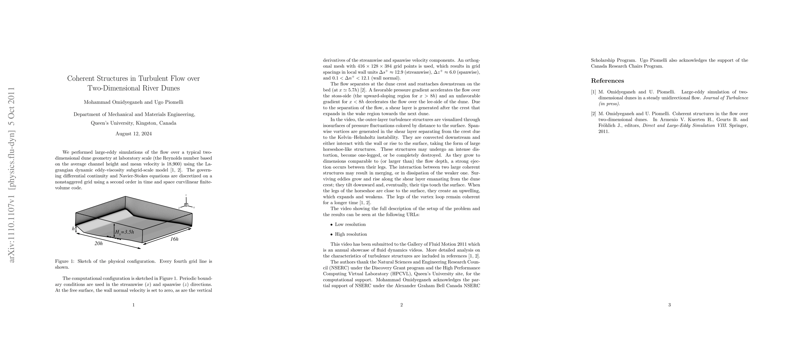 Researchers used large-eddy simulations to study turbulence over two-dimensional river dunes, finding that a shear layer forms after separation at the crest, generating horseshoe-like structures that grow, interact, and eventually dissipate. These coherent structures play a key role in shaping the flow and can merge or destroy each other.
