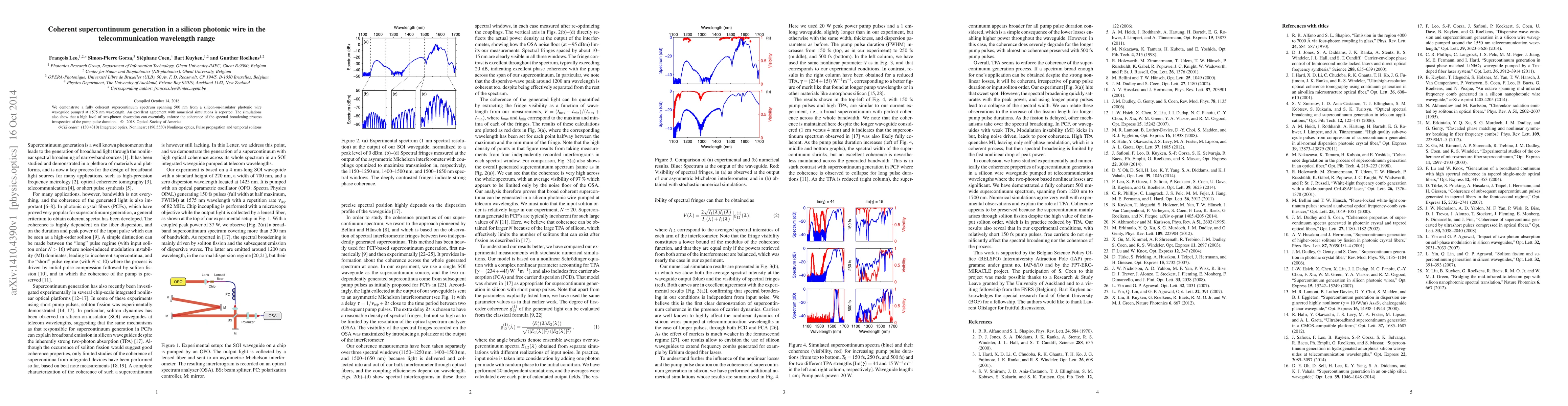 This paper demonstrates coherent supercontinuum generation in a silicon photonic wire, achieving a 500 nm spectrum from 1575 nm pumping, with strong coherence maintained by two-photon absorption, as validated by numerical simulations.