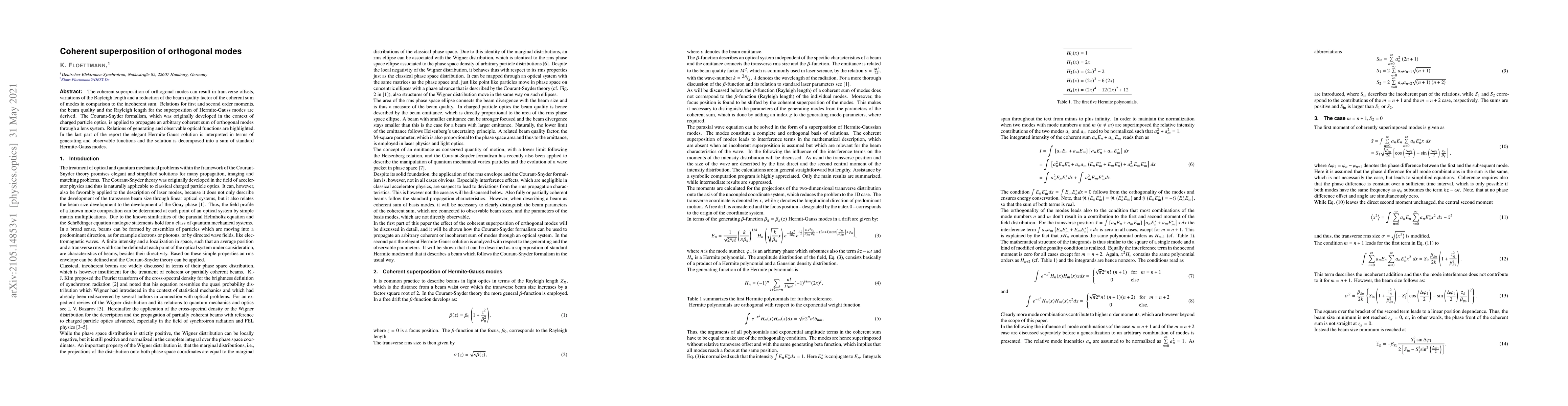 This paper explores the coherent superposition of orthogonal modes, deriving relations for first and second-order moments, beam quality, and Rayleigh length. It applies the Courant-Snyder formalism to propagate these superpositions through lenses and decomposes the Hermite-Gauss solution into standard modes.
