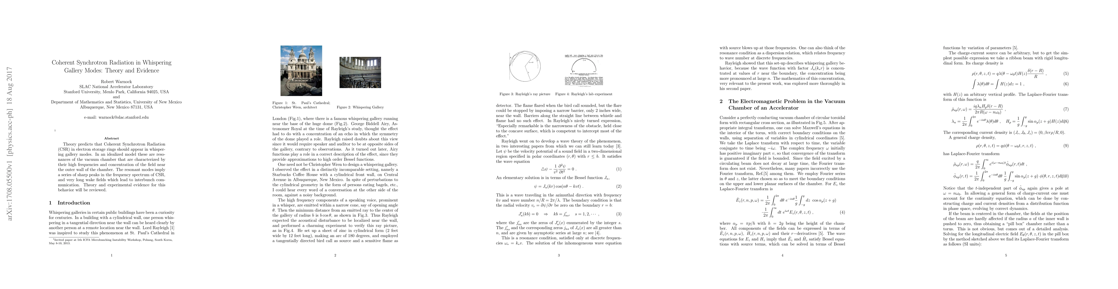 Theory predicts that Coherent Synchrotron Radiation (CSR) in electron storage rings should appear in whispering gallery modes. In an idealized model these are resonances of the vacuum chamber that are characterized by their high frequencies and concentration of the field near the outer wall of the chamber. The resonant modes imply a series of sharp peaks in the frequency spectrum of CSR, and very long wake fields which lead to interbunch communication. Theory and experimental evidence for this behavior will be reviewed.