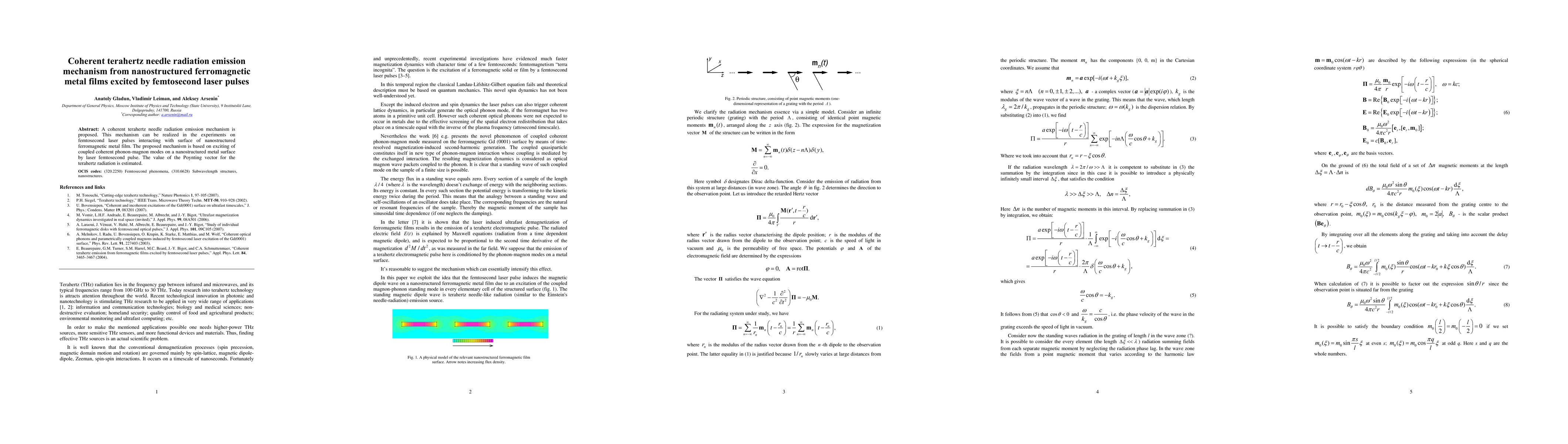 This paper proposes a mechanism for coherent terahertz needle radiation emission from nanostructured ferromagnetic metal films excited by femtosecond laser pulses, attributing the effect to coupled coherent phonon-magnon modes on the metal surface. The study estimates the Poynting vector value for the emitted terahertz radiation.