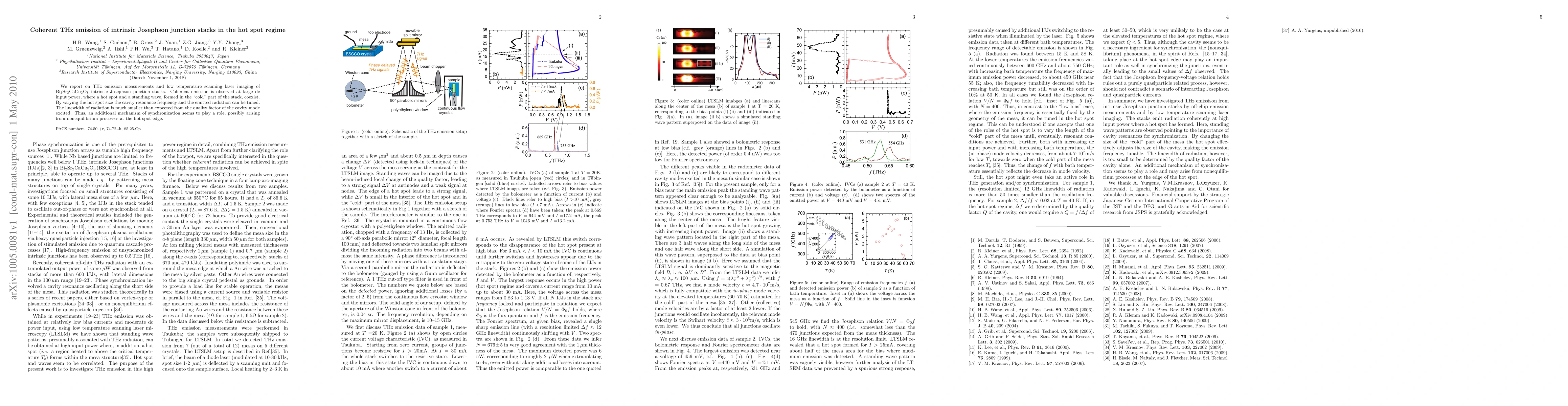 We report on THz emission measurements and low temperature scanning laser imaging of Bi_2Sr_2CaCu_2O_8 intrinsic Josephson junction stacks. Coherent emission is observed at large dc input power, where a hot spot and a standing wave, formed in the "cold" part of the stack, coexist. By varying the hot spot size the cavity resonance frequency and the emitted radiation can be tuned. The linewidth of radiation is much smaller than expected from the quality factor of the cavity mode excited. Thus, an additional mechanism of synchronization seems to play a role, possibly arising from nonequilibrium processes at the hot spot edge.
