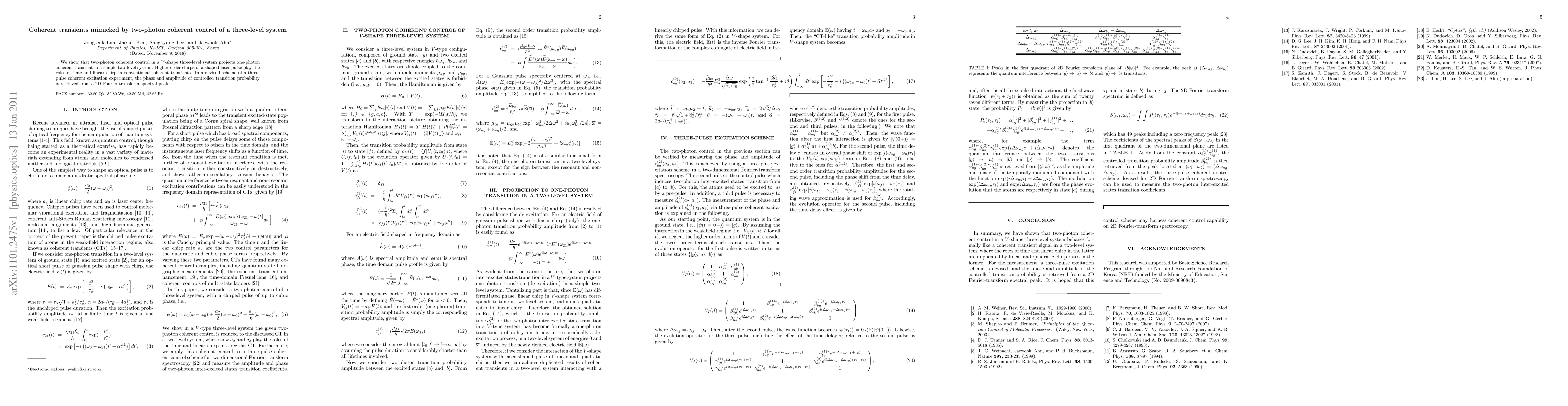 This research demonstrates that two-photon coherent control in a $V$-shaped three-level system can mimic one-photon coherent transients in a two-level system, utilizing higher-order chirps. The phase and amplitude of the controlled transition probability are retrieved via a 2D Fourier-transform spectral peak in a three-pulse excitation experiment.