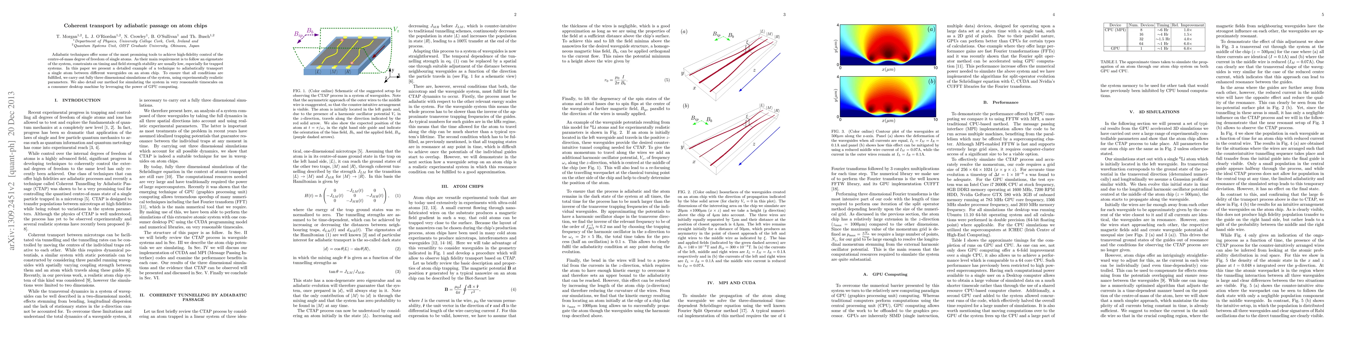 Adiabatic techniques offer some of the most promising tools to achieve high-fidelity control of the centre-of-mass degree of freedom of single atoms. As their main requirement is to follow an eigenstate of the system, constraints on timing and field strength stability are usually low, especially for trapped systems. In this paper we present a detailed example of a technique to adiabatically transport a single atom between different waveguides on an atom chip. To ensure that all conditions are fulfilled, we carry out fully three dimensional simulations of the system, using experimentally realistic parameters. We also detail our method for simulating the system in very reasonable timescales on a consumer desktop machine by leveraging the power of GPU computing.