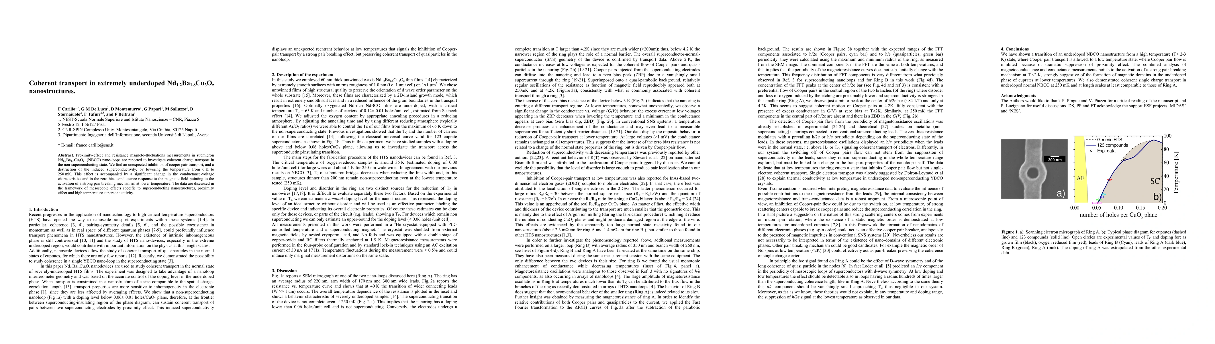 This study investigates coherent charge transport in underdoped Nd1.2Ba1.8Cu3Oz nanostructures, revealing an unexpected inhibition of Cooper pair transport and destruction of induced superconductivity as temperature decreases, accompanied by significant changes in conductance and magnetic field response, suggesting a strong pair breaking mechanism. The findings are analyzed through the lens of mesoscopic effects in superconducting nanostructures.