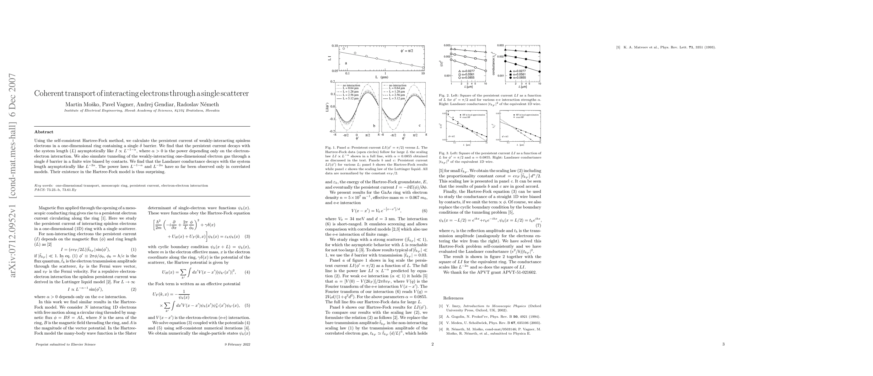 This paper uses the self-consistent Hartree-Fock method to study the transport of weakly-interacting electrons through a one-dimensional ring with a delta-barrier, finding persistent current decay as $I \propto L^{-1-\alpha}$. It also examines tunneling through a delta-barrier in a finite wire, revealing Landauer conductance decay as $L^{-2\alpha}$, which is typically observed in correlated models but found here in the Hartree-Fock model.