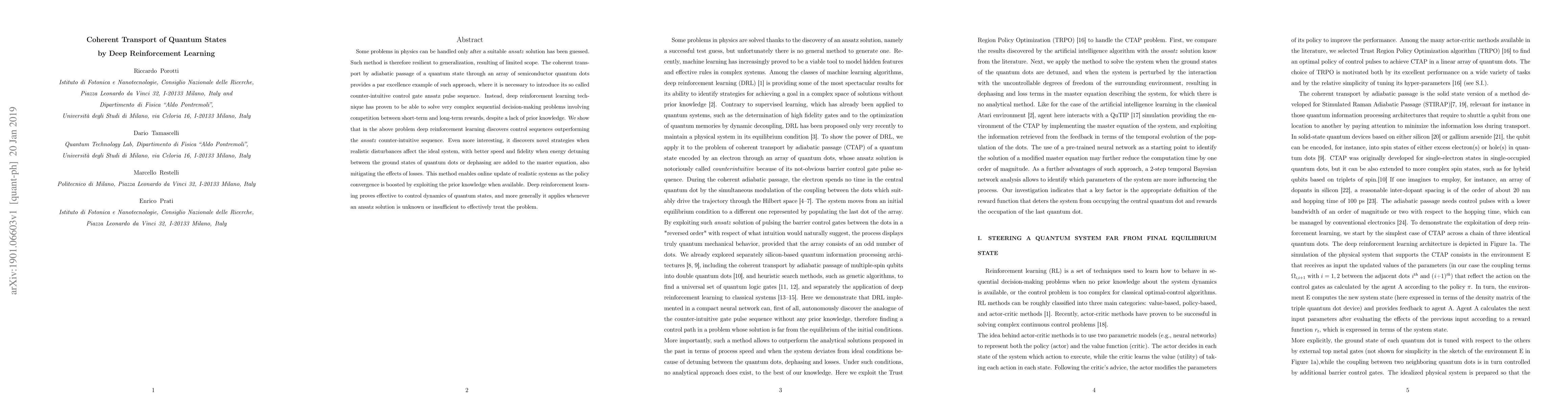 Some problems in physics can be handled only after a suitable \textit{ansatz }solution has been guessed. Such method is therefore resilient to generalization, resulting of limited scope. The coherent transport by adiabatic passage of a quantum state through an array of semiconductor quantum dots provides a par excellence example of such approach, where it is necessary to introduce its so called counter-intuitive control gate ansatz pulse sequence. Instead, deep reinforcement learning technique has proven to be able to solve very complex sequential decision-making problems involving competition between short-term and long-term rewards, despite a lack of prior knowledge. We show that in the above problem deep reinforcement learning discovers control sequences outperforming the \textit{ansatz} counter-intuitive sequence. Even more interesting, it discovers novel strategies when realistic disturbances affect the ideal system, with better speed and fidelity when energy detuning between the ground states of quantum dots or dephasing are added to the master equation, also mitigating the effects of losses. This method enables online update of realistic systems as the policy convergence is boosted by exploiting the prior knowledge when available. Deep reinforcement learning proves effective to control dynamics of quantum states, and more generally it applies whenever an ansatz solution is unknown or insufficient to effectively treat the problem.