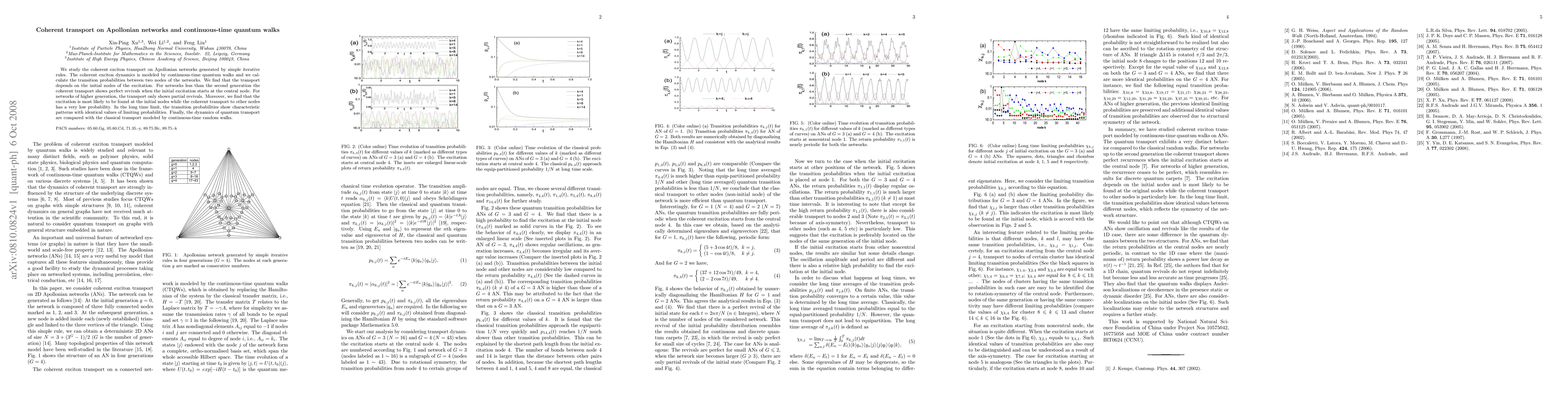 This paper investigates coherent exciton transport on Apollonian networks using continuous-time quantum walks, revealing perfect revivals in lower generation networks and partial revivals in higher ones. The transport dynamics show a preference for returning to initial nodes, with distinct long-time transition probability patterns compared to classical continuous-time random walks.