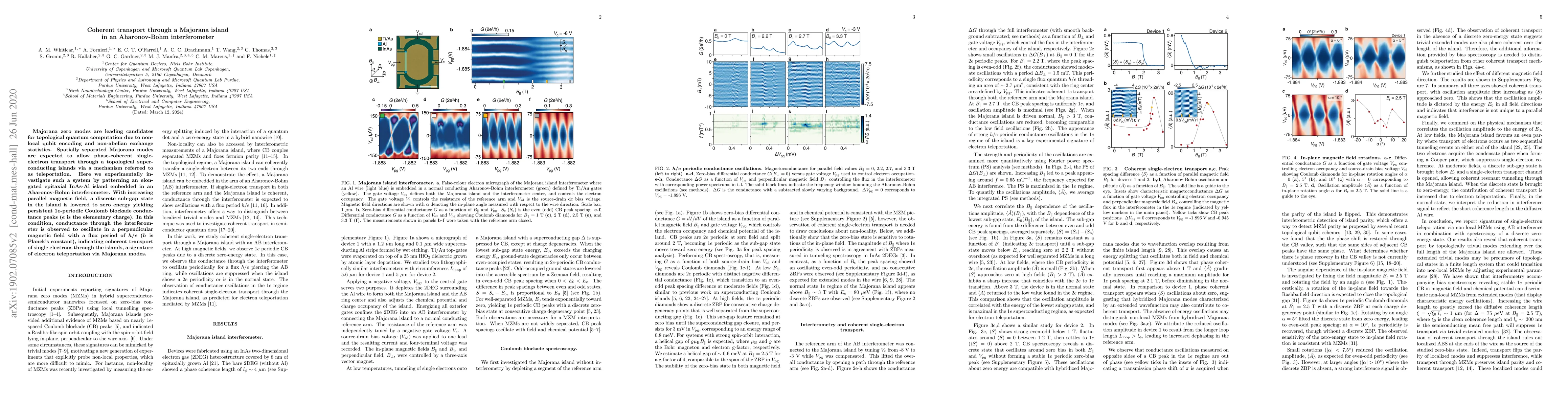 This research experimentally investigates coherent transport through a topological superconducting island in an Aharonov-Bohm interferometer, observing persistent conductance peaks and flux-periodic oscillations indicating single-electron teleportation via Majorana modes, though non-Majorana mechanisms also contribute.
