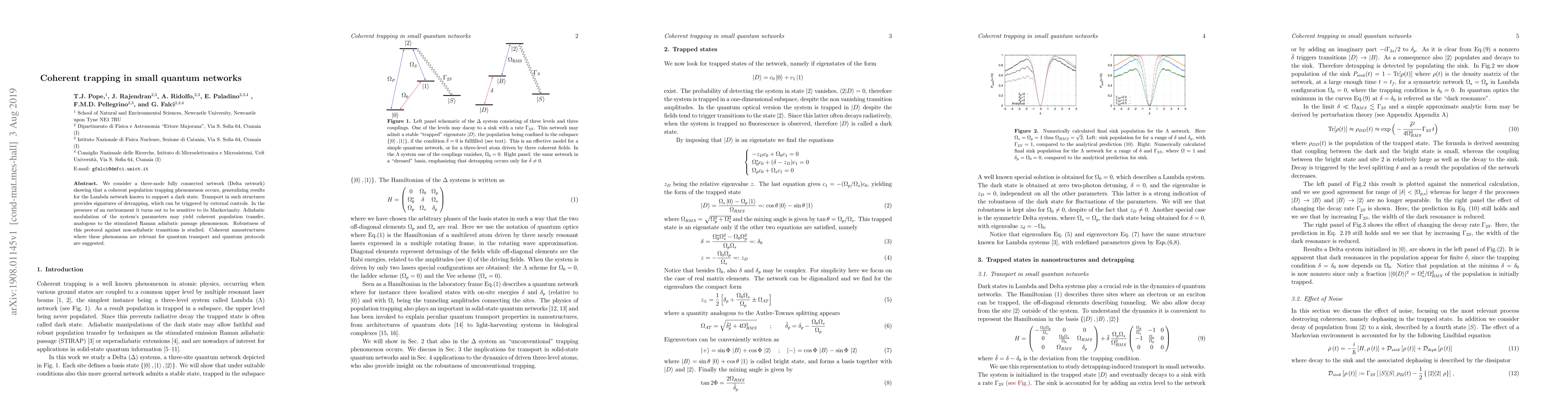 We consider a three-node fully connected network (Delta network) showing that a coherent population trapping phenomenon occurs, generalizing results for the Lambda network known to support a dark state. Transport in such structures provides signatures of detrapping, which can be triggered by external controls. In the presence of an environment it turns out to be sensitive to its Markovianity. Adiabatic modulation of the system's parameters may yield coherent population transfer, analogous to the stimulated Raman adiabatic passage phenomenon. Robustness of this protocol against non-adiabatic transitions is studied. Coherent nanostructures where these phenomena are relevant for quantum transport and quantum protocols are suggested.