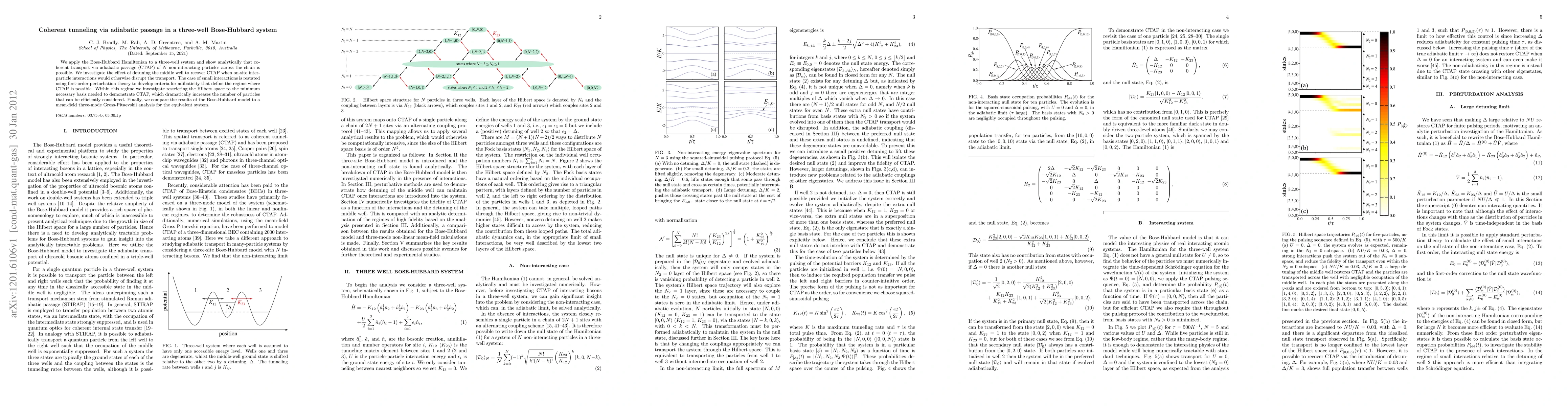 This paper demonstrates coherent tunneling via adiabatic passage in a three-well Bose-Hubbard system, showing analytically that $N$ non-interacting particles can be transported via CTAP. It also explores the recovery of CTAP through detuning the middle well and uses perturbation theory to define adibaticity criteria, significantly enhancing the number of particles that can be efficiently considered.