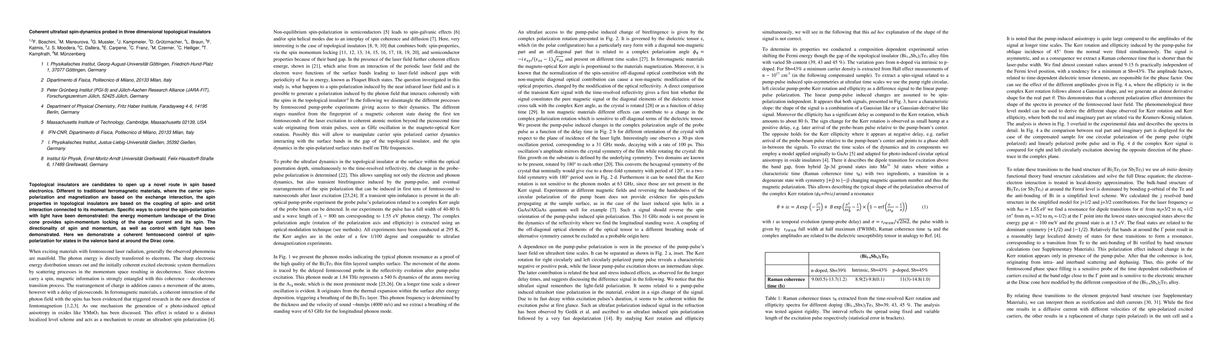 This paper investigates the coherent ultrafast spin dynamics in three-dimensional topological insulators, demonstrating femtosecond control over spin-polarization in the valence band near the Dirac cone. The study highlights the unique spin-momentum locking and light-induced control of spin properties in these materials, positioning them as promising candidates for spin-based electronics.