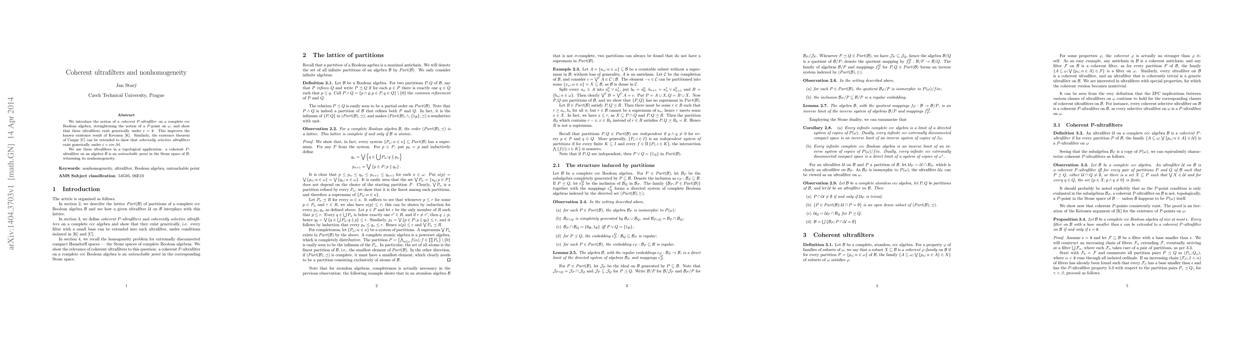 We introduce the notion of a coherent $P$-ultrafilter on a complete ccc Boolean algebra, strenghtening the notion of a $P$-point on $\omega$, and show that these ultrafilters exist generically under ${\mathfrak c} = {\mathfrak d}$. This improves the known existence result of Ketonen. Similarly, the existence theorem of Canjar can be extended to show that coherently selective ultrafilters exist generically under ${\mathfrak c} = {cov(M)}$. We use these ultrafilters in a topological application: a coherent $P$-ultrafilter on an algebra $B$ is an untouchable point in the Stone space of $B$, witnessing its nonhomogeneity.
