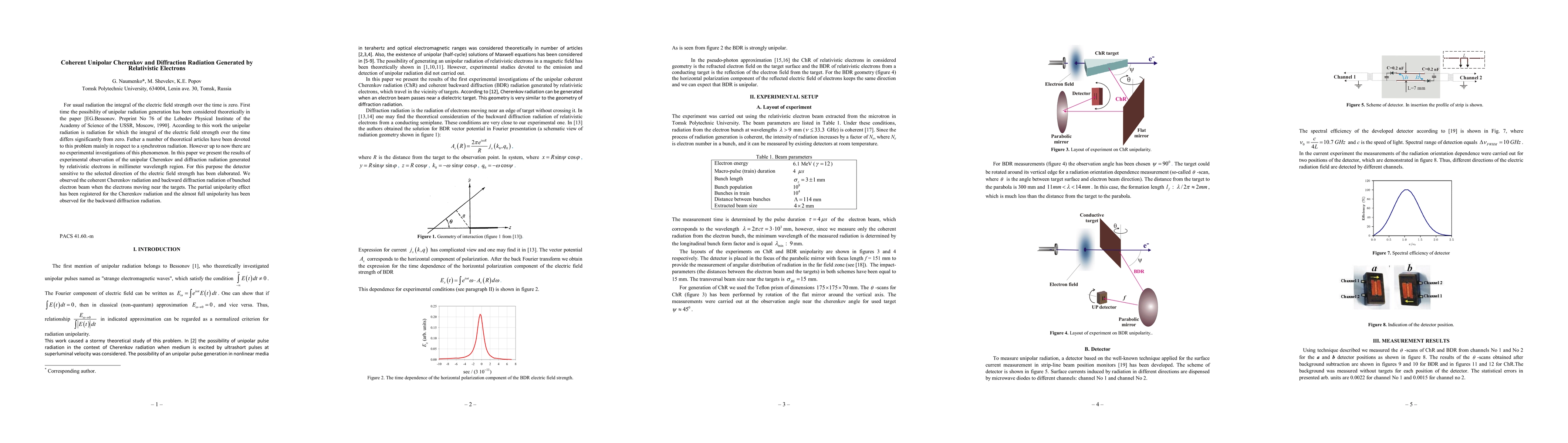 For usual radiation the integral of the electric field strength over the time is zero. First time the possibility of unipolar radiation generation has been considered theoretically in the paper [EG.Bessonov. Preprint No 76 of the Lebedev Physical Institute of the Academy of Science of the USSR, Moscow, 1990]. According to this work the unipolar radiation is radiation for which the integral of the electric field strength over the time differs significantly from zero. Futher a number of theoretical articles have been devoted to this problem mainly in respect to a synchrotron radiation. However up to now there are no experimental investigations of this phenomenon. In this paper we present the results of experimental observation of the unipolar Cherenkov and diffraction radiation generated by relativistic electrons in millimeter wavelength region. For this purpose the detector sensitive to the selected direction of the electric field strength has been elaborated. We observed the coherent Cherenkov radiation and backward diffraction radiation of bunched electron beam when the electrons moving near the targets. The partial unipolarity effect has been registered for the Cherenkov radiation and the almost full unipolarity has been observed for the backward diffraction radiation.