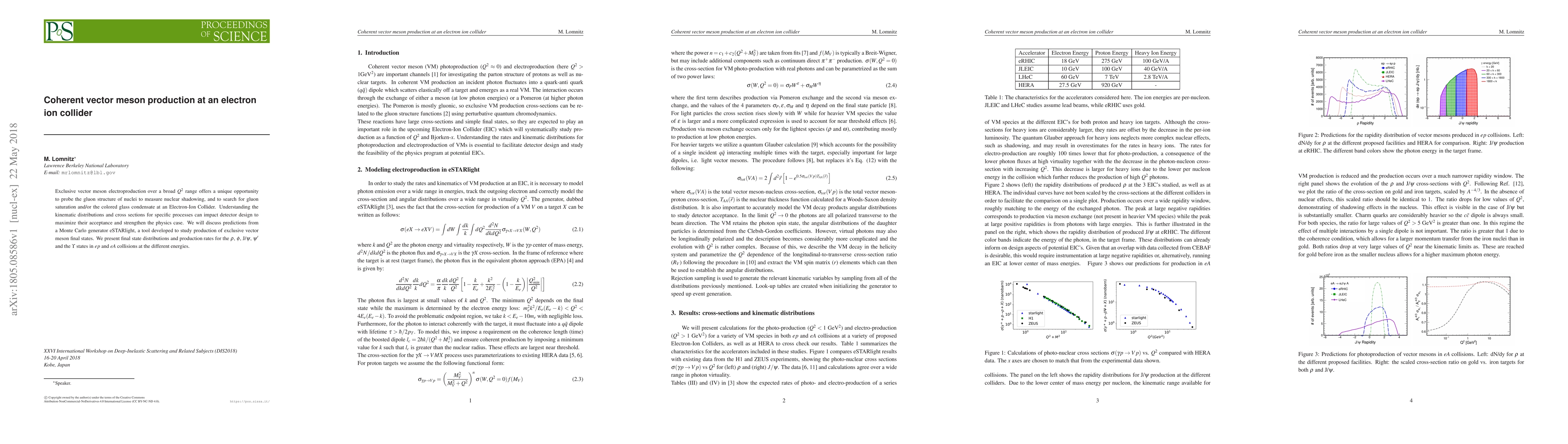 Exclusive vector meson electroproduction over a broad $Q^2$ range offers a unique opportunity to probe the gluon structure of nuclei to measure nuclear shadowing, and to search for gluon saturation and/or the colored glass condensate at an Electron-Ion Collider. Understanding the kinematic distributions and cross sections for specific processes can impact detector design to maximize their acceptance and strengthen the physics case. We will discuss predictions from a Monte Carlo generator eSTARlight, a tool developed to study production of exclusive vector meson final states. We present final state distributions and production rates for the $\rho$, $\phi$, J/$\psi$, $\psi'$ and the $\Upsilon$ states in $ep$ and $eA$ collisions at the different energies.