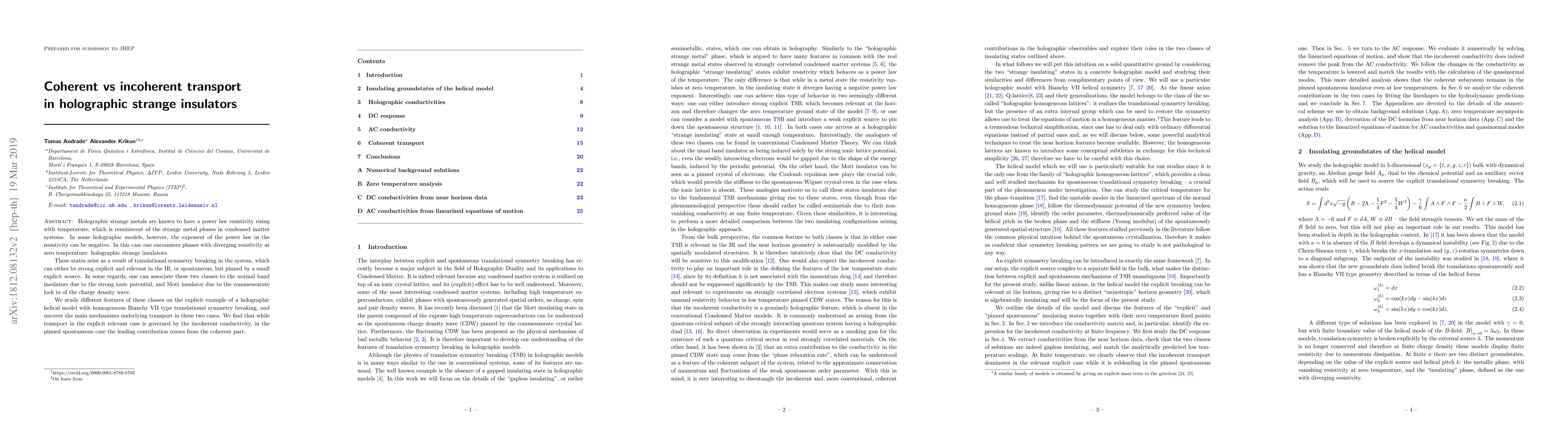Holographic strange metals are known to have a power law resistivity rising with temperature, which is reminiscent of the strange metal phases in condensed matter systems. In some holographic models, however, the exponent of the power law in the resistivity can be negative. In this case one encounters phases with diverging resistivity at zero temperature: holographic strange insulators. These states arise as a result of translational symmetry breaking in the system, which can either be strong explicit and relevant in the IR, or spontaneous, but pinned by a small explicit source. In some regards, one can associate these two classes to the normal band insulators due to the strong ionic potential, and Mott insulator due to the commensurate lock in of the charge density wave. We study different features of these classes on the explicit example of a holographic helical model with homogeneous Bianchy VII type translational symmetry breaking, and uncover the main mechanisms underlying transport in these two cases. We find that while transport in the explicit relevant case is governed by the incoherent conductivity, in the pinned spontaneous case the leading contribution comes from the coherent part.