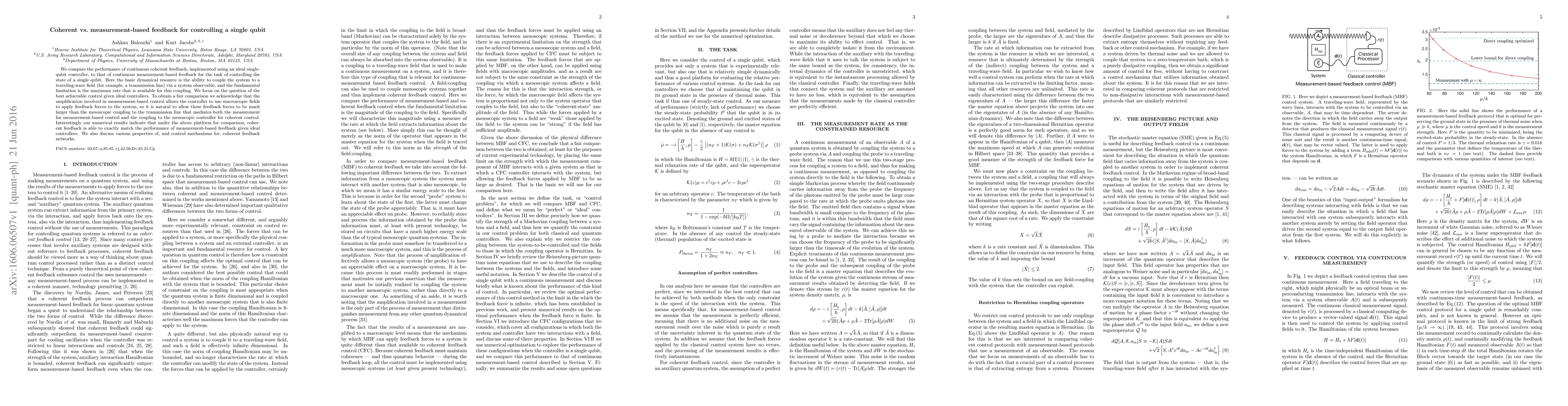 This paper compares the performance of coherent feedback and measurement-based feedback for controlling a single qubit, finding that coherent feedback can match measurement-based feedback under ideal conditions. The study highlights the role of macroscopic fields in measurement-based control and discusses the properties of coherent feedback networks.