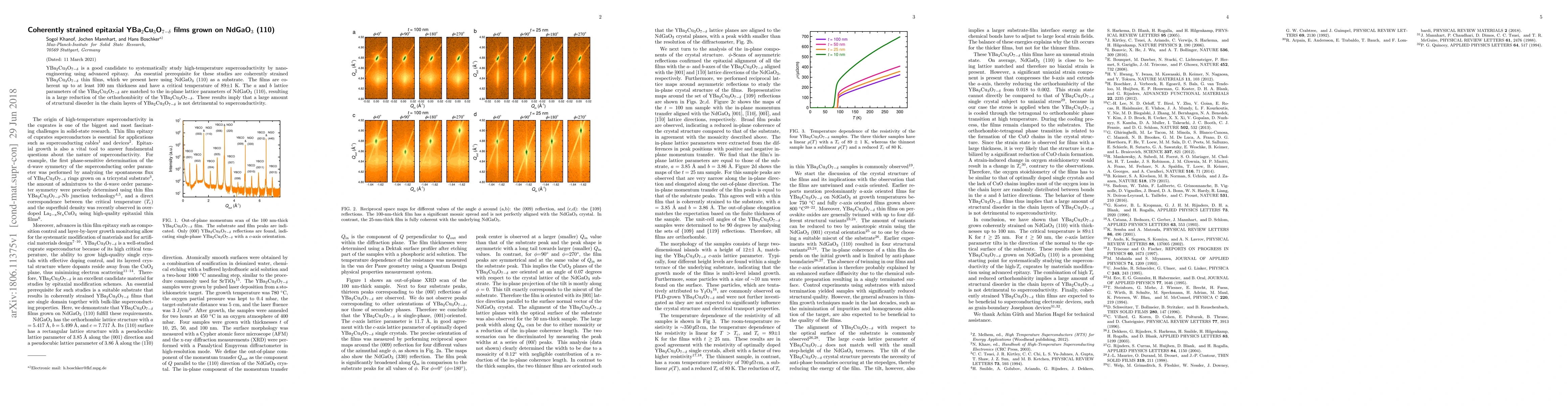 This study presents coherently strained epitaxial YBa$_2$Cu$_3$O$_{7-\delta}$ films grown on NdGaO$_3$ (110) substrates, maintaining coherence up to 100 nm thickness and achieving a critical temperature of 89$\pm$1 K. The epitaxial strain minimizes orthorhombicity, suggesting structural disorder in the chain layers does not impede superconductivity.