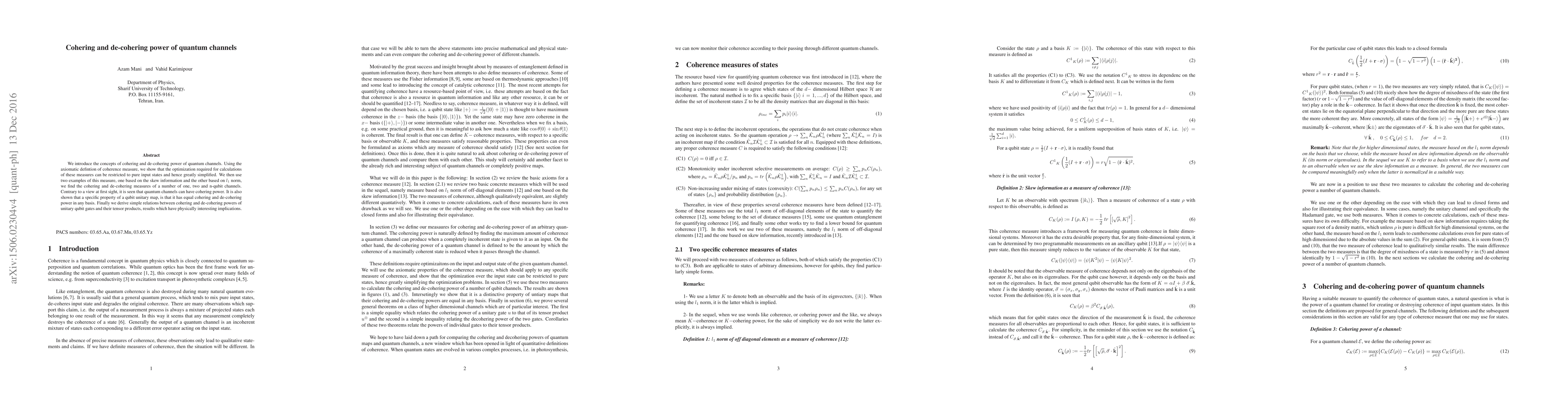 This paper introduces the concepts of cohering and de-cohering power for quantum channels, simplifying the optimization of coherence measures using pure input states. It demonstrates that quantum channels can exhibit cohering power and reveals equal cohering and de-cohering power for specific qubit unitary maps, with implications for unitary qubit gates and their tensor products.
