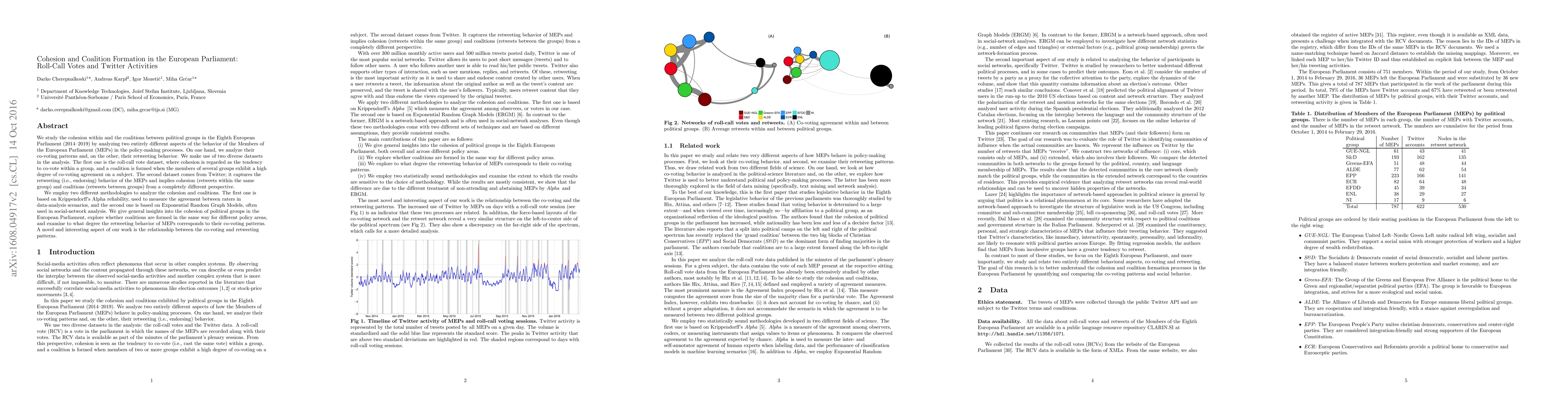 This paper examines cohesion within and coalitions between political groups in the European Parliament by analyzing co-voting patterns from roll-call votes and retweeting behavior on Twitter. It employs Krippendorff's Alpha and Exponential Random Graph Models to explore these dynamics, providing insights into how MEPs' social media activity correlates with their voting behavior.