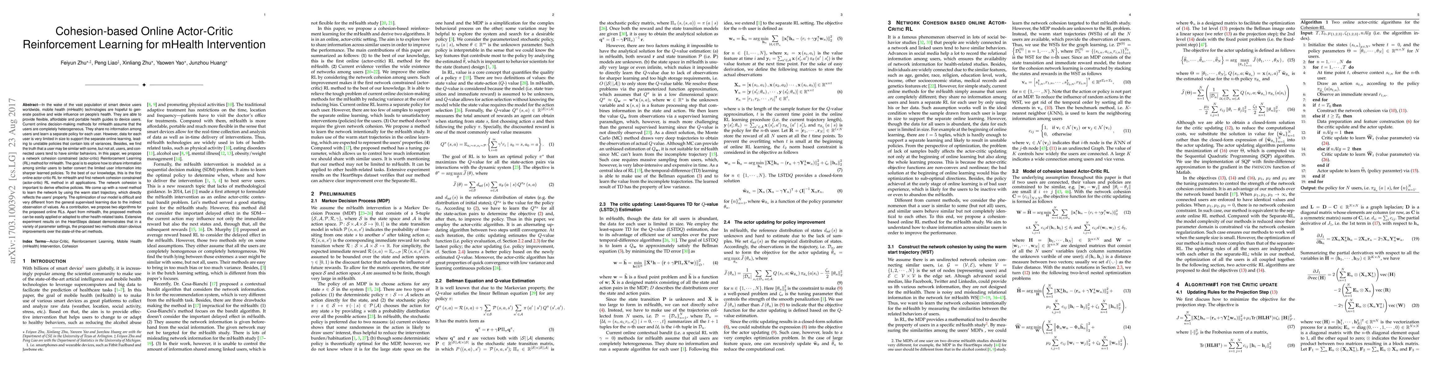 This paper proposes a novel cohesion-based online actor-critic Reinforcement Learning method for mobile health interventions, aiming to share information among similar users to improve policy learning. The method demonstrates significant improvements over state-of-the-art techniques in experiments using the HeartSteps dataset.