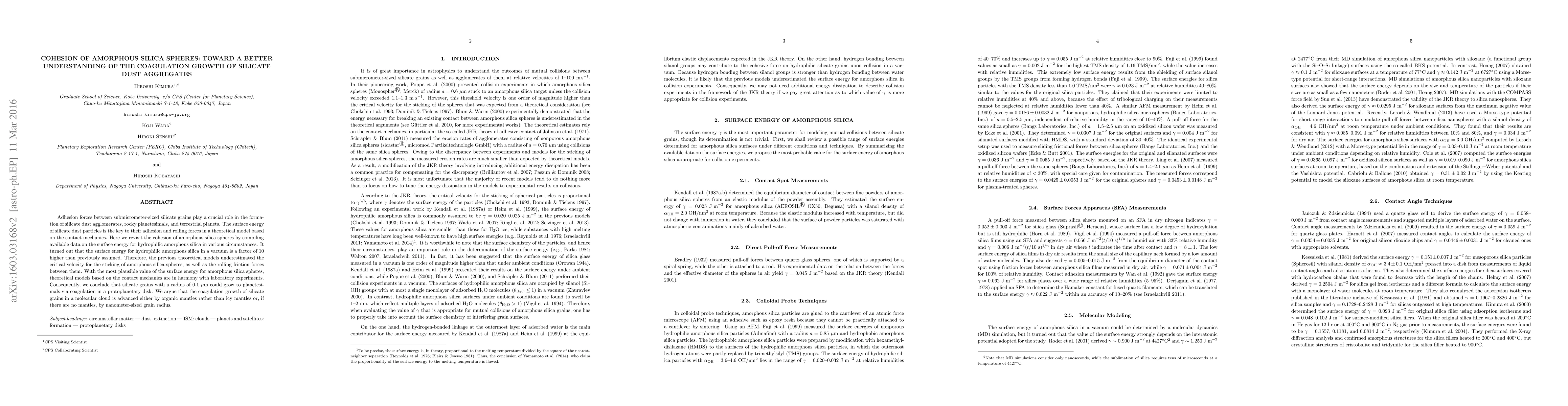 This paper investigates the adhesion forces between amorphous silica spheres, crucial for silicate dust agglomerate formation. It reveals that the surface energy of hydrophilic amorphous silica in a vacuum is ten times higher than previously thought, correcting theoretical models and aligning them with experimental data.