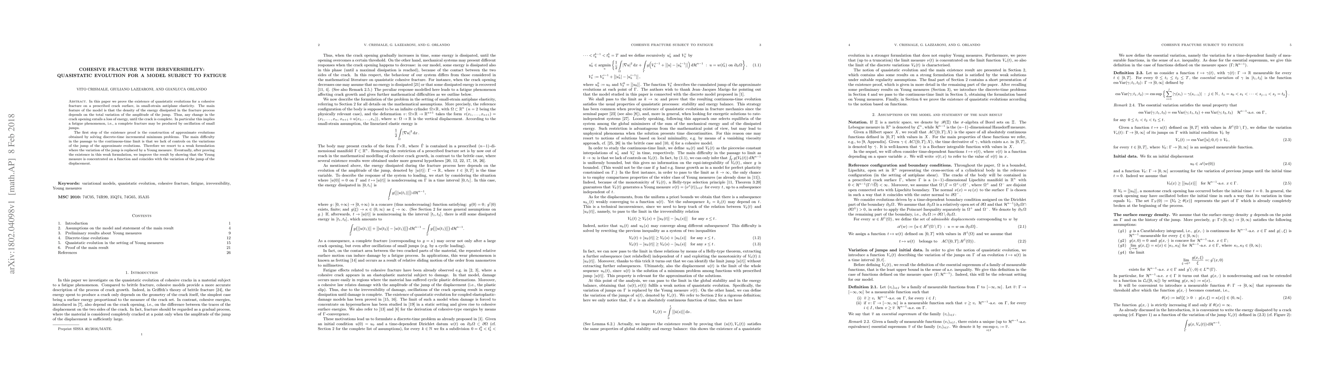 This research paper presents a model for cohesive fracture in elastic materials, proving the existence of quasistatic evolutions on a prescribed crack surface. The key feature is energy dissipation dependent on the total variation of the crack opening jump, leading to a fatigue phenomenon where small oscillations can cause complete fracture. The existence proof involves constructing approximate evolutions from discrete-time incremental minimum problems and addressing variations in jump amplitude using a weak formulation with Young measures. The study's implications are significant for understanding fracture mechanics and material fatigue.