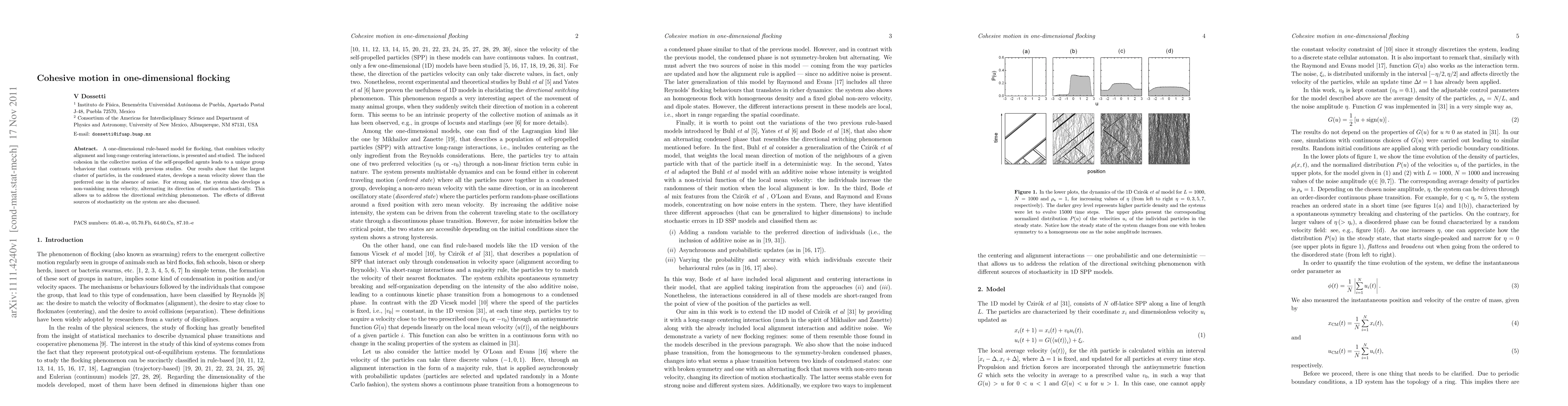 A one-dimensional rule-based model for flocking, that combines velocity alignment and long-range centering interactions, is presented and studied. The induced cohesion in the collective motion of the self-propelled agents leads to a unique group behaviour that contrasts with previous studies. Our results show that the largest cluster of particles, in the condensed states, develops a mean velocity slower than the preferred one in the absence of noise. For strong noise, the system also develops a non-vanishing mean velocity, alternating its direction of motion stochastically. This allows us to address the directional switching phenomenon. The effects of different sources of stochasticity on the system are also discussed.