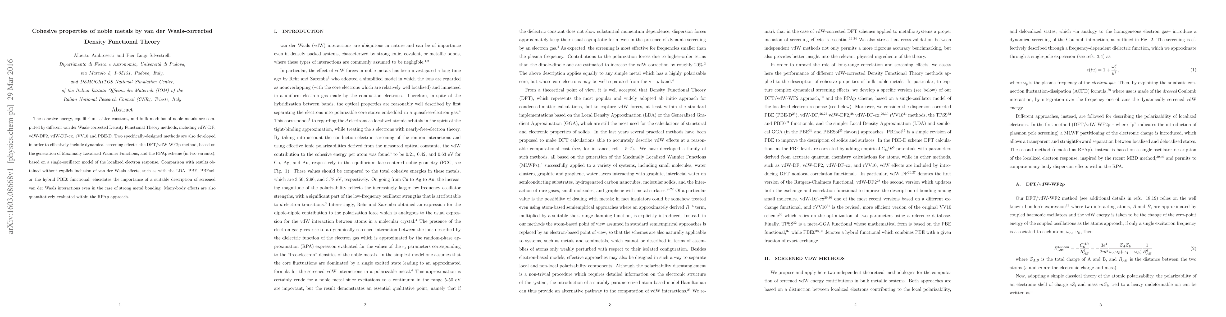 The paper presents and compares various van der Waals-corrected DFT methods, introducing two new methods (DFT/vdW-WF2p and RPAp) specifically designed to handle dynamical screening effects in noble metals. It provides a comprehensive analysis of cohesive properties, highlighting the significance of including van der Waals interactions even in strong metal bonding scenarios.