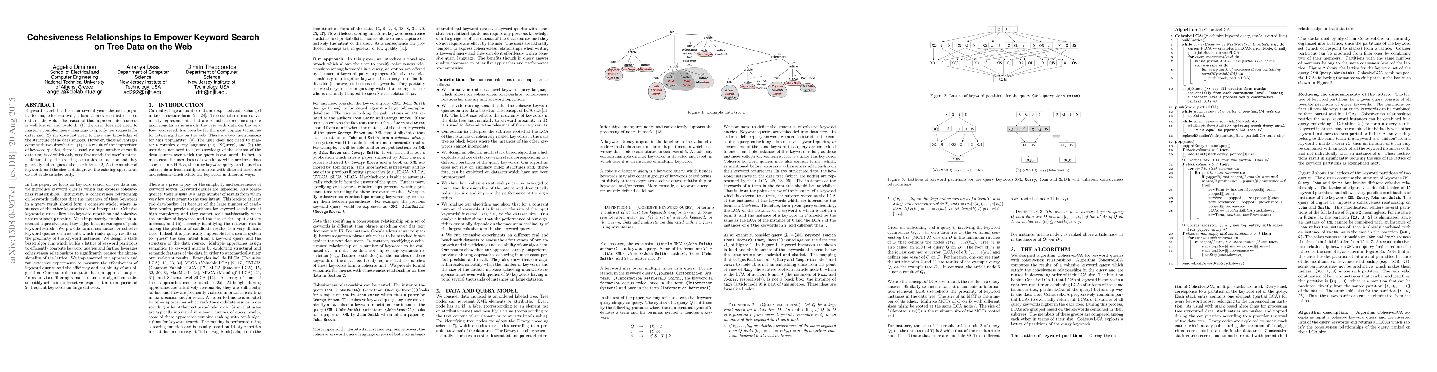 Keyword search is the most popular querying technique on semistructured data. Keyword queries are simple and con- venient. However, as a consequence of their imprecision, the quality of their answers is poor and the existing algorithms do not scale satisfactorily. In this paper, we introduce the novel concept of cohesive keyword queries for tree data. Intuitively, a cohesiveness relationship on keywords indicates that they should form a cohesive whole in a query result. Cohesive keyword queries allow term nesting and keyword repetition. Although more expressive, they are as simple as flat keyword queries. We provide formal semantics for cohesive keyword queries rank- ing query results on the proximity of the keyword instances. We design a stack based algorithm which efficiently evaluates cohesive keyword queries. Our experiments demonstrate that our approach outperforms in quality previous filtering semantics and our algorithm scales smoothly on queries of even 20 keywords on large datasets.